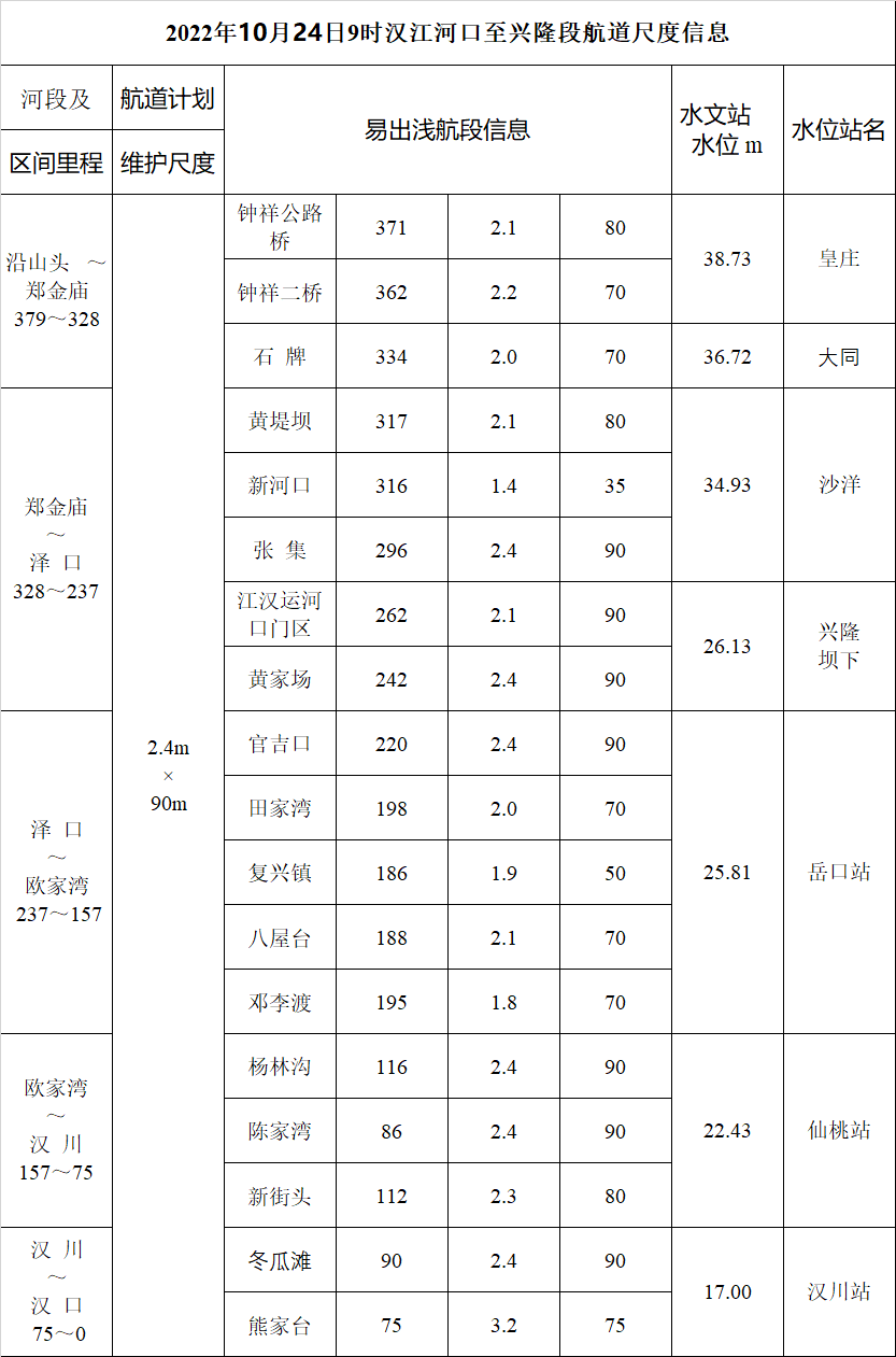 汉江河口至兴隆段航道尺度信息(2022年10月24日9时)