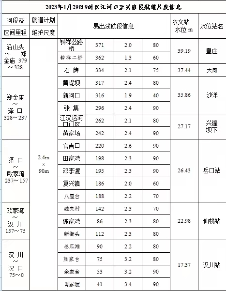 汉江河口至兴隆段航道尺度信息(2023年1月29日9时)