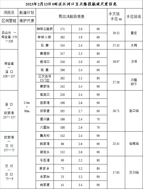 汉江河口至兴隆段航道尺度信息(2023年2月13日9时)