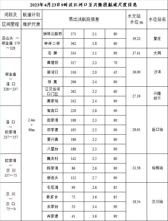 汉江河口至兴隆段航道尺度信息(2023年4月24日9时)