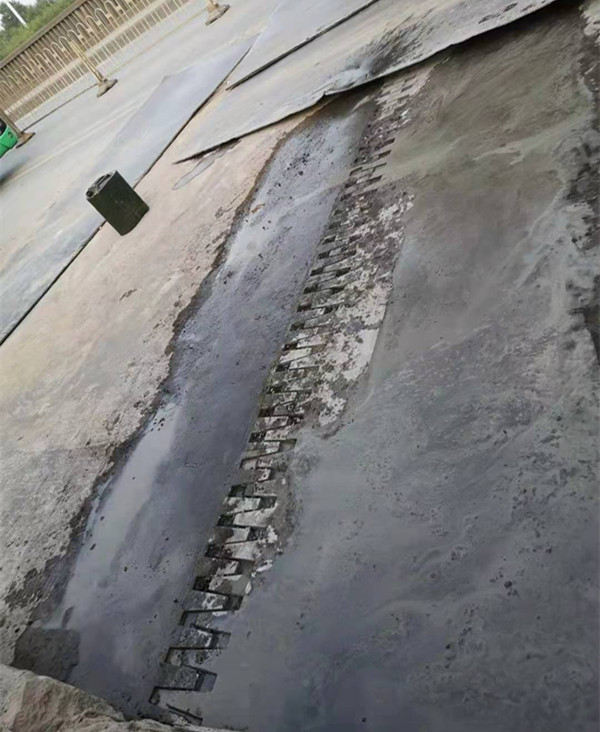 G347汉施公路新河大桥于1991年10月建成通车,双向四车道。随着社会经济的发展,车流量与日俱增,特别是大型重载货运车不断增加,桥梁出现不同程度的病害。近期出现进城向第二道伸缩缝和出城向第二道伸缩缝破损现象,并在连续雨天和大量货运重载车的作用下,病害发展迅速,伸缩缝包边砼碎裂、钢板脱落,严重危及行车安全。为保障车辆正常通行,公路中心应急保障站立即加铺钢板进行了临时处置。同时上报公路中心,并迅速组织专业技术人员制定维修方案。