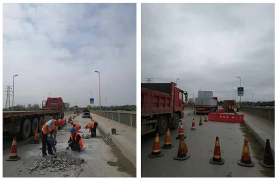 此次维修养护,主要是利用该桥节假日交通流量较平日相对较小的通行规律,于10月5日-7日组织集中维修,以减少日常维修的通行影响。虽较平日交通条件有所改善,但养护队伍依然面临着时间紧、作业面小、边通车边维修等实际困难。为保障维修路段通行安全,养护队伍严格按照《公路养护安全作业规程》及《公路养护技术规范》组织作业,局部封闭车道交通,作业区设置警示标志牌和锥桶,安排专人指挥交通,采取机械配合人工的方式对破碎的水泥混凝土进行凿除,利用高性能材料进行填补,大大缩短了养护作业时间。