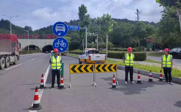 “报告!马鞍山隧道S104向天鹅湖大道方向左侧因连日降雨导致隧道锥坡轻度滑坡,导致交通阻断!”大集管理站巡查人员的紧急上报,瞬间点燃了演练现场的紧张气氛。现场指挥长沉着应对,立即下达指令:安全保障组火速前往现场维护秩序、疏导交通;应急保障组和装备保障组迅速集结人员、调配物资赶赴现场;后勤保障组准备通勤、医疗等后勤支持。各小组闻令而动,按照应急预案以最快速度赶赴预定位置:安全保障人员率先对阻断路段实施封控,引导车辆有序绕行;应急保障组工程技术人员迅速对现场进行勘查评估,果断提出采用沙袋加固锥坡、疏导积水、清理塌方泥石土的方案;装备保障组调试各类抢险设备,随时待命。