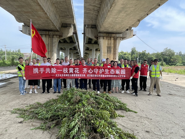 2025年6月17日上午,东西湖区公路管理局党支部与武汉临空港公共设施运营管理公司党支部以“携手共除一枝黄花,齐心守护生态家园”为主题,在中法友谊大桥下开展加拿大一枝黄花外来物种的专项铲除行动,这已是双方连续第二年联合开展此项生态保卫活动。