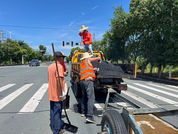 面对滚烫的“烤”验,蔡甸区公路段养护人员以高度的责任担当迎难而上,加密巡查频次,织就“全天候、全覆盖”的防护网。各一线管理站在严格保障高温作业安全的前提下,形成“快速反应、协同作战”的高效处置模式。抢修过程中,职工们严格按照养护规范操作:切割机精准切割病害区域,确保修补边界方正整齐;吹风机清除坑槽内的杂物与灰尘,保障基底干净无浮尘;随后将高温沥青混凝土均匀摊铺至病害处,最后由振动压路机反复碾压,确保修复区域密实平整、无缝衔接。整套流程环环相扣,既保证了抢修速度,又确保了修复质量。据统计,自7月以来已高效修复路面病害458平方米,完成沥青灌缝2480米。