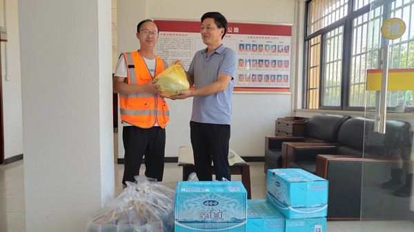 酷暑中坚守的身影,牵动着管理段领导的心。7月15日,“夏日送清凉”慰问活动深入一线。矿泉水、绿豆、毛巾等防暑物资被送到养护职工手中,传递着组织的深切关怀。段领导仔细询问大家的工作强度与生活保障,反复叮嘱:“务必做好防暑降温,安全永远要放在首位!”同时高度肯定职工们战高温、保畅通的奉献精神,强调要科学安排作业时间,坚持“防暑”与“保畅”两手抓。
