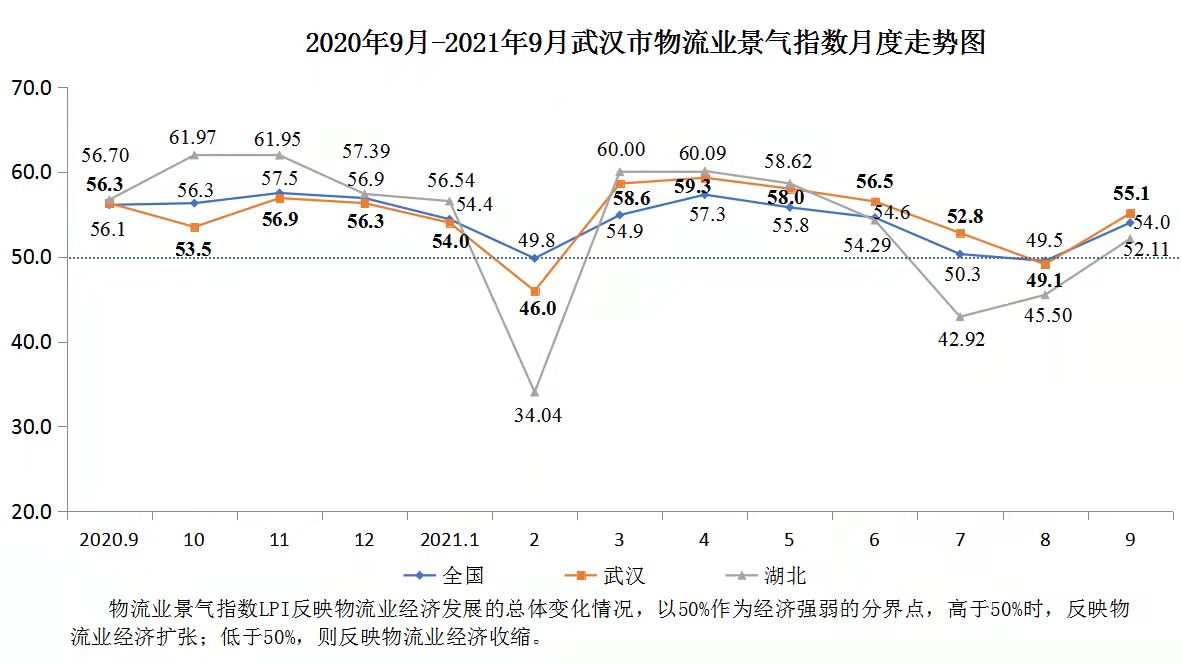 2021年9月,武汉市物流业景气指数(LPI)为55.1%,较上月回升6.1个百分点,高于全国同期(54.0%)1.1个百分点。随着“金九银十”生产建设旺季的到来,中秋国庆“双节”消费促进,叠加政府提振消费的发力,全市物流需求旺盛,业务活动活跃,指数结束在连续5个月回落走势下实现回升。