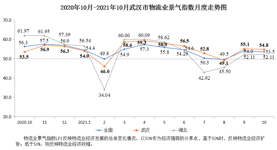 2021年10月,武汉市物流业景气指数(LPI)为54.8%,较上月回落0.3个百分点,高于全国同期(53.5%)1.3个百分点,全市物流业景气指数有所回落但仍位于扩张区间。受疫情反复和相关成本上涨影响,物流业务活动增速有所放缓。在国庆假日消费提振与电商促销临近影响下,消费端物流保持活跃态势,物流业运行整体稳中有升、保持适度增长。