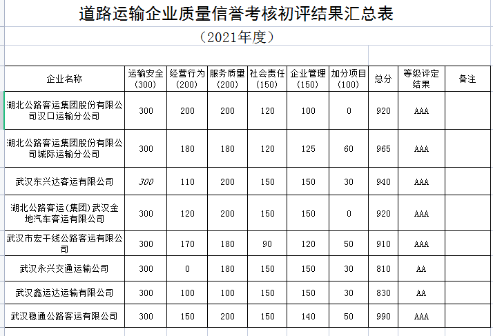 根据湖北省交通运输厅《关于上报2021年度湖北省道路客货运输企业质量信誉考核和汽车客运站服务信誉等级考核结果的通知》以及《湖北省道路客货运输企业质量信誉实施办法》(鄂运物安〔2011〕139号)的文件精神,现将2021年度道路客运企业质量信誉考核辖区初评结果予以公示。公示期为2022年7月4日至2022年7月22日,公示期内,被考核企业或者其他单位、个人对公示结果如有异议,可在公示期内向我中心书面申诉或者举报。