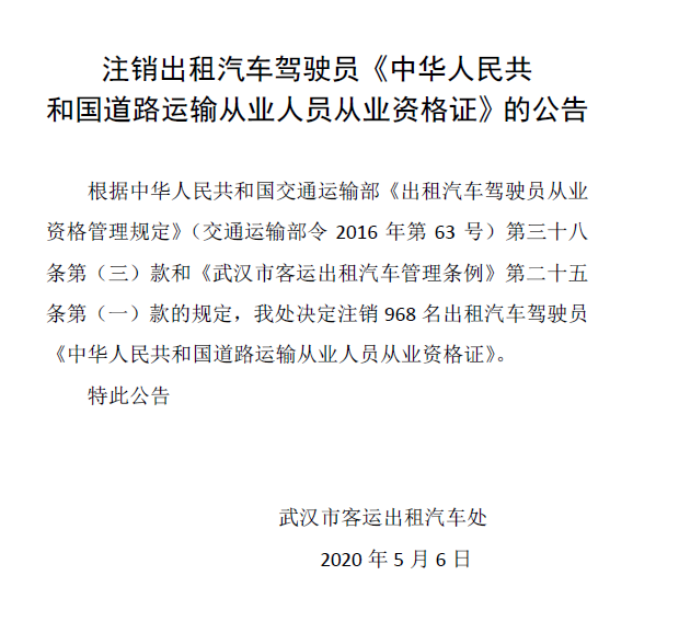 注销出租汽车驾驶员《中华人民共和国道路运输从业人员从业资格证》的公告