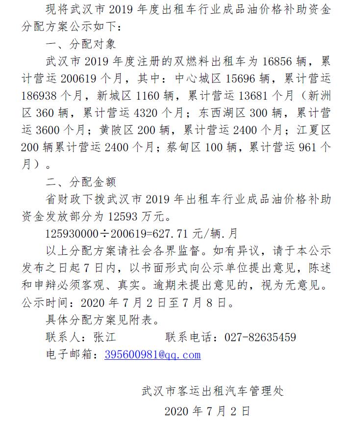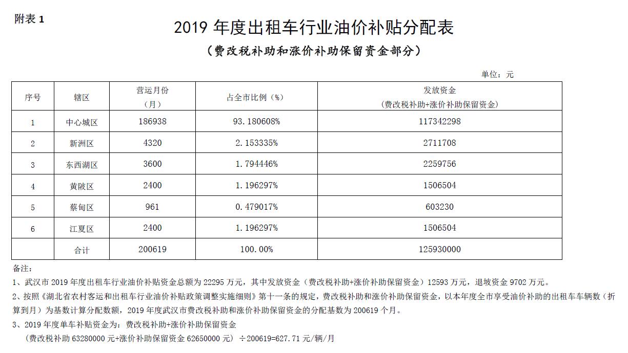 武汉市2019 年度出租车行业成品油价格补助资金分配方案公示