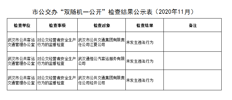 市公交办“双随机 一公开”检查结果公示表(2020年11月)