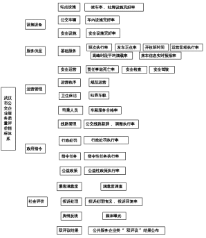 本次考核评价总分100份,内容主要包括设施设备(15分)、服务供应(25分)、运营管理(28分)、政府指令(12分)、社会评价(20分)五个部分,其中“社会评价”中重点对“乘客满意度评价(5分)”进行了专篇评价。评价指标体系如下所示。