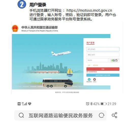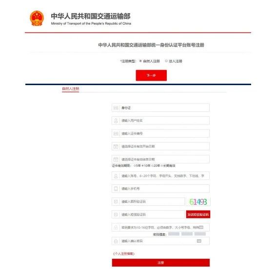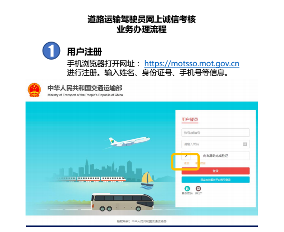 关注、注册。关注交通部便民政务系统、“道路运政一网通办”微信小程序、“道运通”手机APP、国家/省级政务服务平台,输入姓名、身份证号、手机号等信息完成注册。