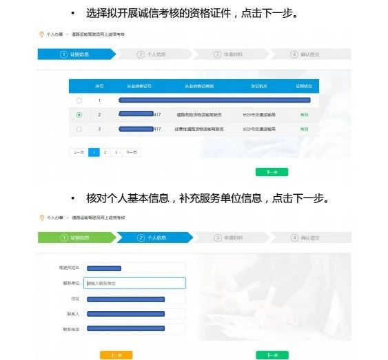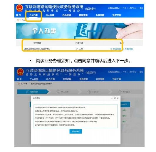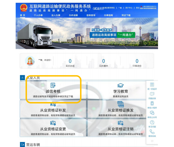 开始网上办事。用户点击页面上方【个人办事】,选择道路运输驾驶员网上诚信考核的【在线办理】,按提示要求填充相关信息等内容,逐步点击下一步,最后提交,即可进行网上诚信考核。