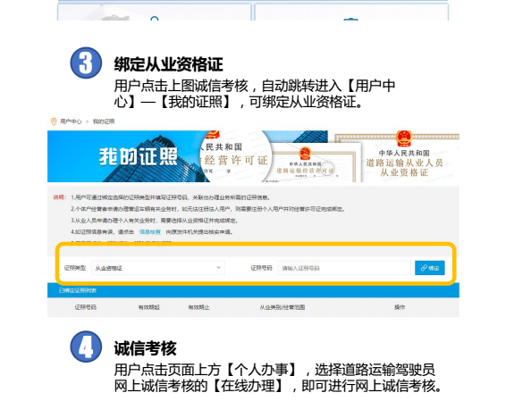 绑定从业资格证。用户点击登录页面诚信考核等任一业务选项,自动跳转进入【用户中心】-【我的证照】,可绑定从业资格证。
