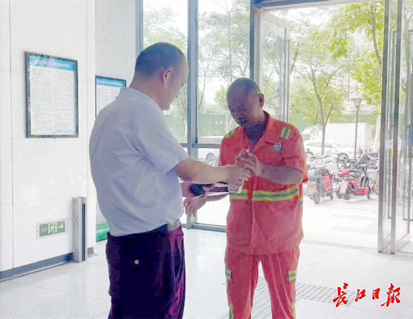 常青城站值班站长给环卫工人送水和扇子,邀请他进来纳凉。