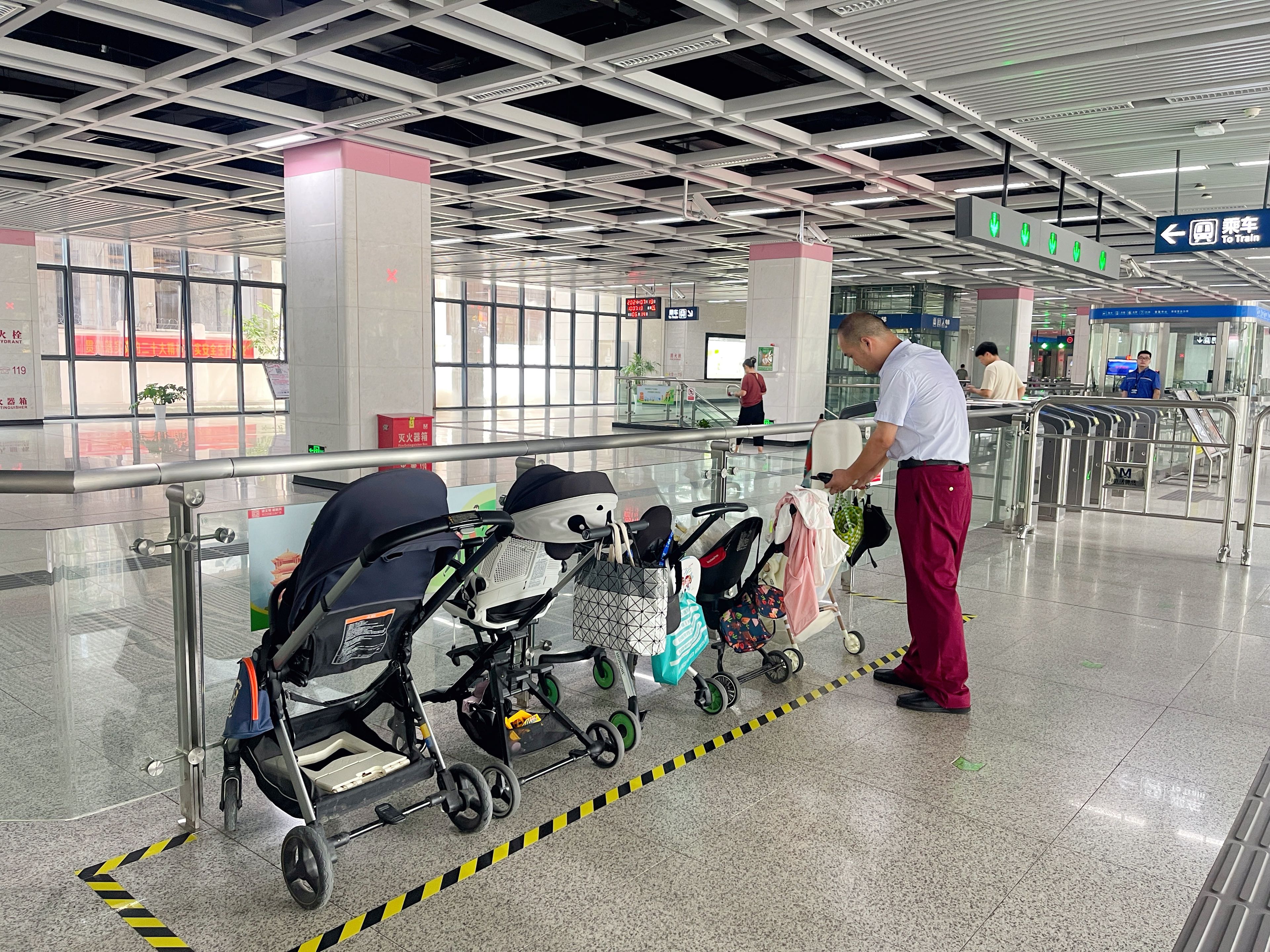 记者在站内看到,对于推婴儿车的宝妈,车站贴心地在纳凉区对面的一块场地开辟出婴儿车停放处。