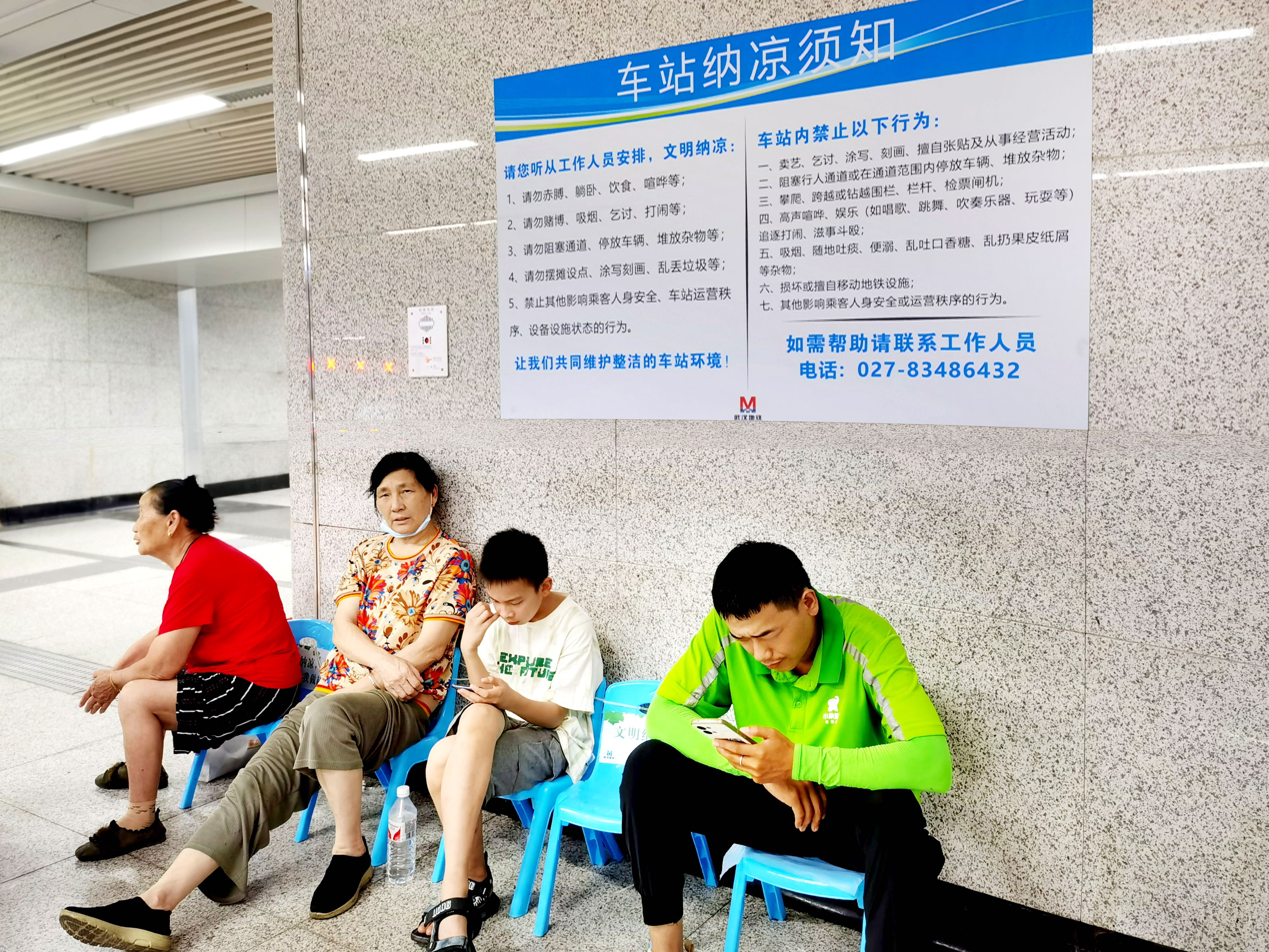 伴随着近日持续的高温,7月22日武汉迎来大暑节气,而武汉地铁的地下车站凉意十足,清爽的环境吸引了很多附近居民消暑纳凉。记者注意到,站内对纳凉区域管理也在不断优化调整,在不影响乘客通行的情况下,积极为纳凉市民提供帮助,并倡导大家文明纳凉。