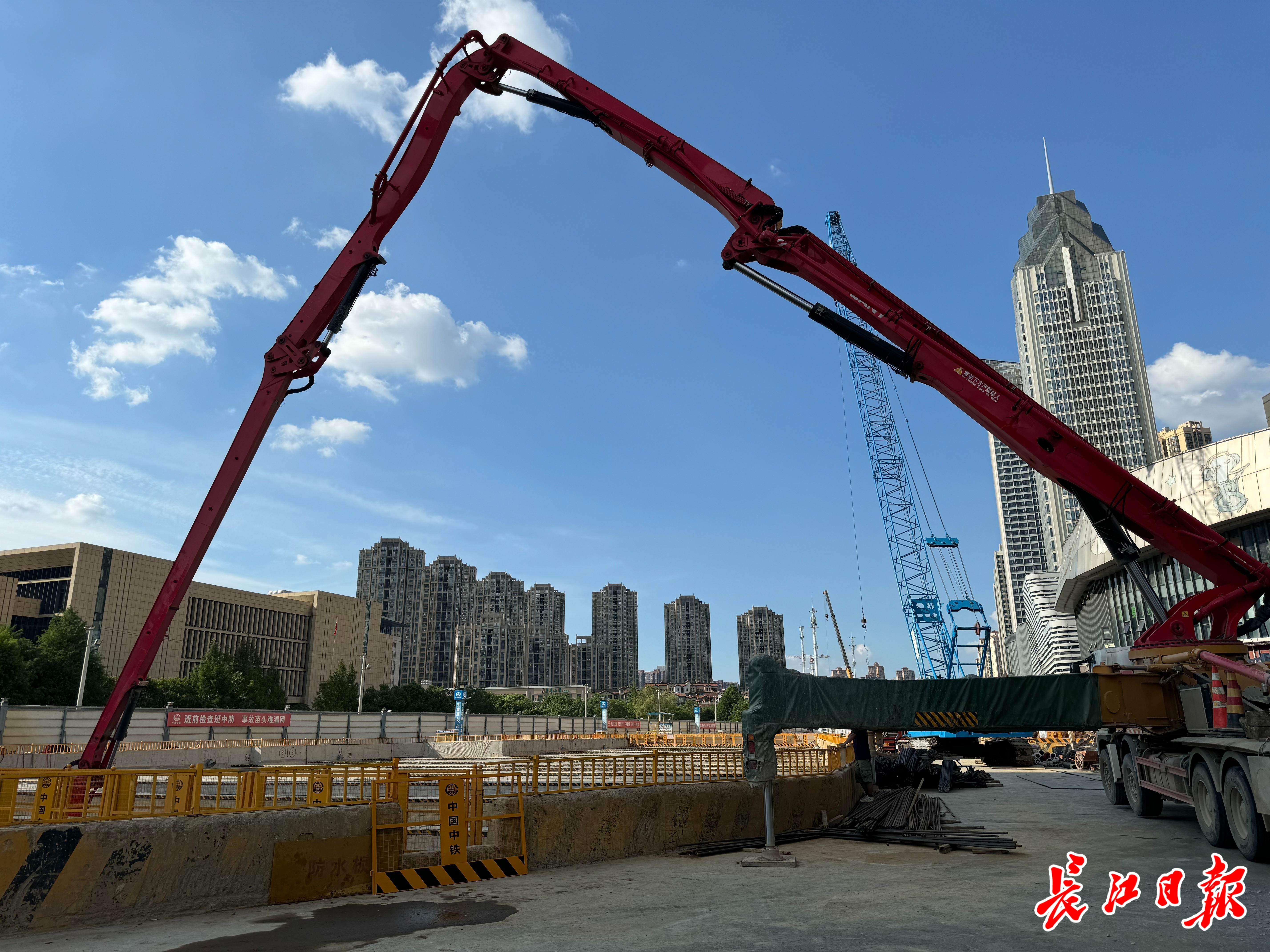 泵车正在浇筑芳草路站最后一块底板混凝土。