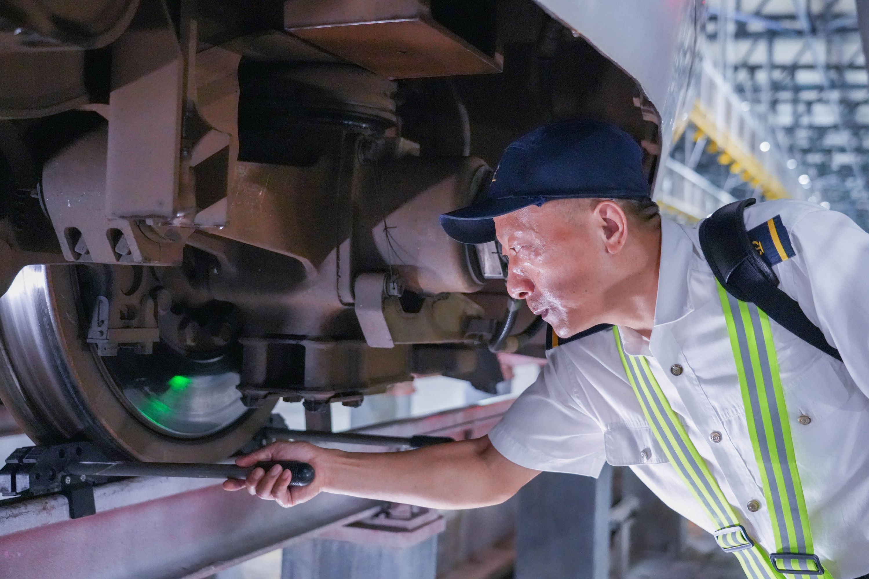 叶贞国在夜间检查动车。
