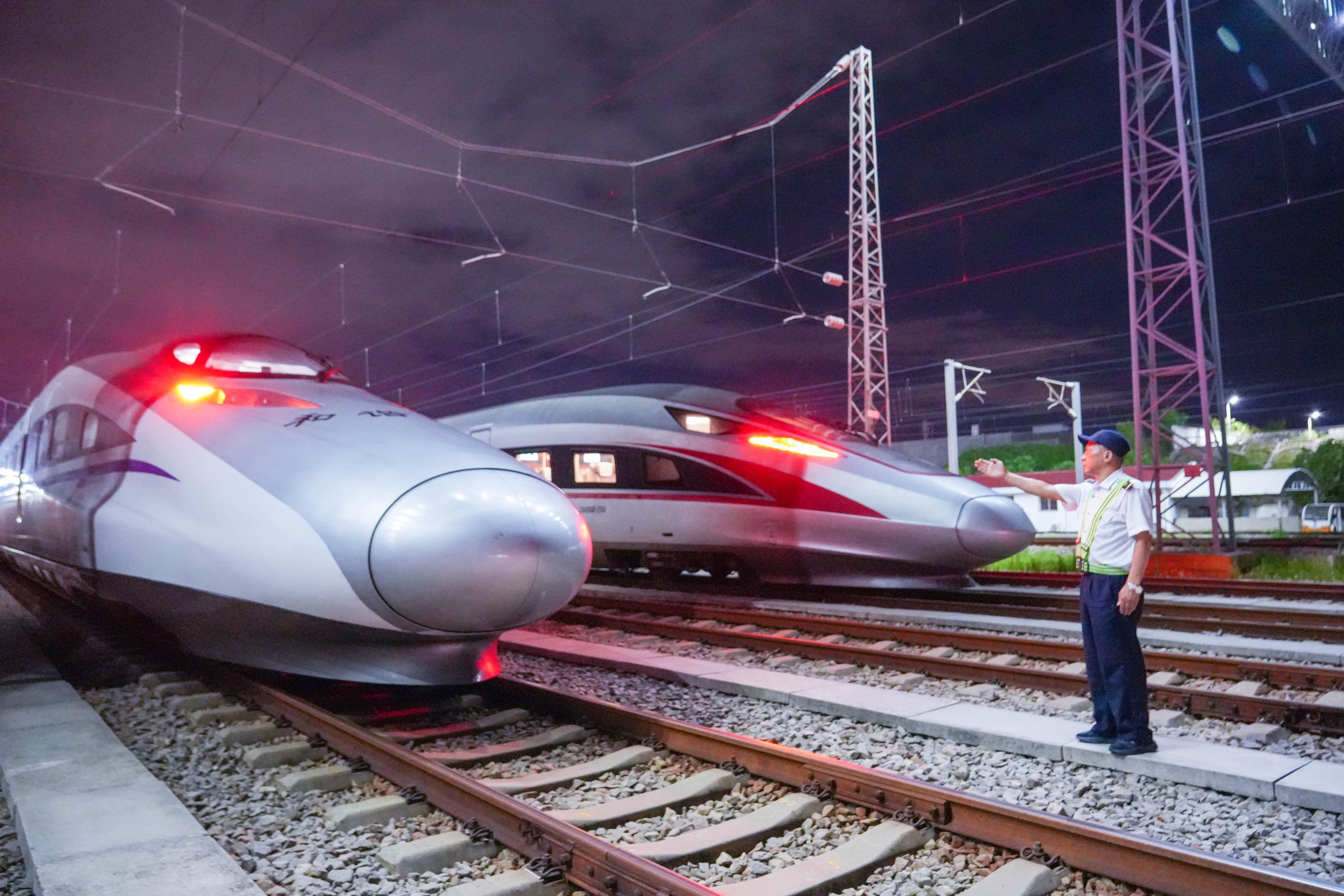 三伏天的深夜检修库内热浪未退,有人驾驶着时速3公里的高铁“摆渡”