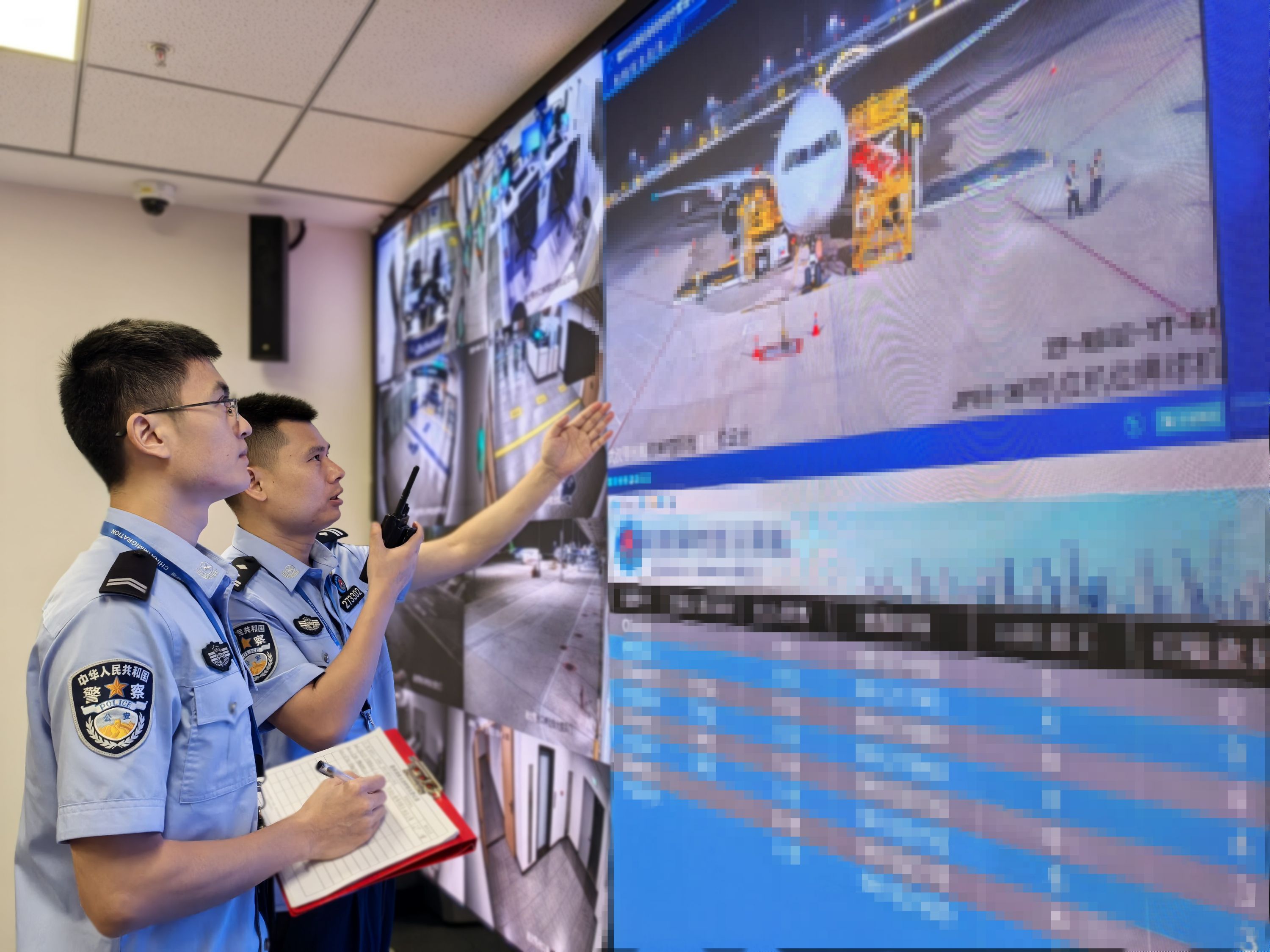 花湖国际机场移民管理警察朱诗渊(左)和同事查看实时航班动态。