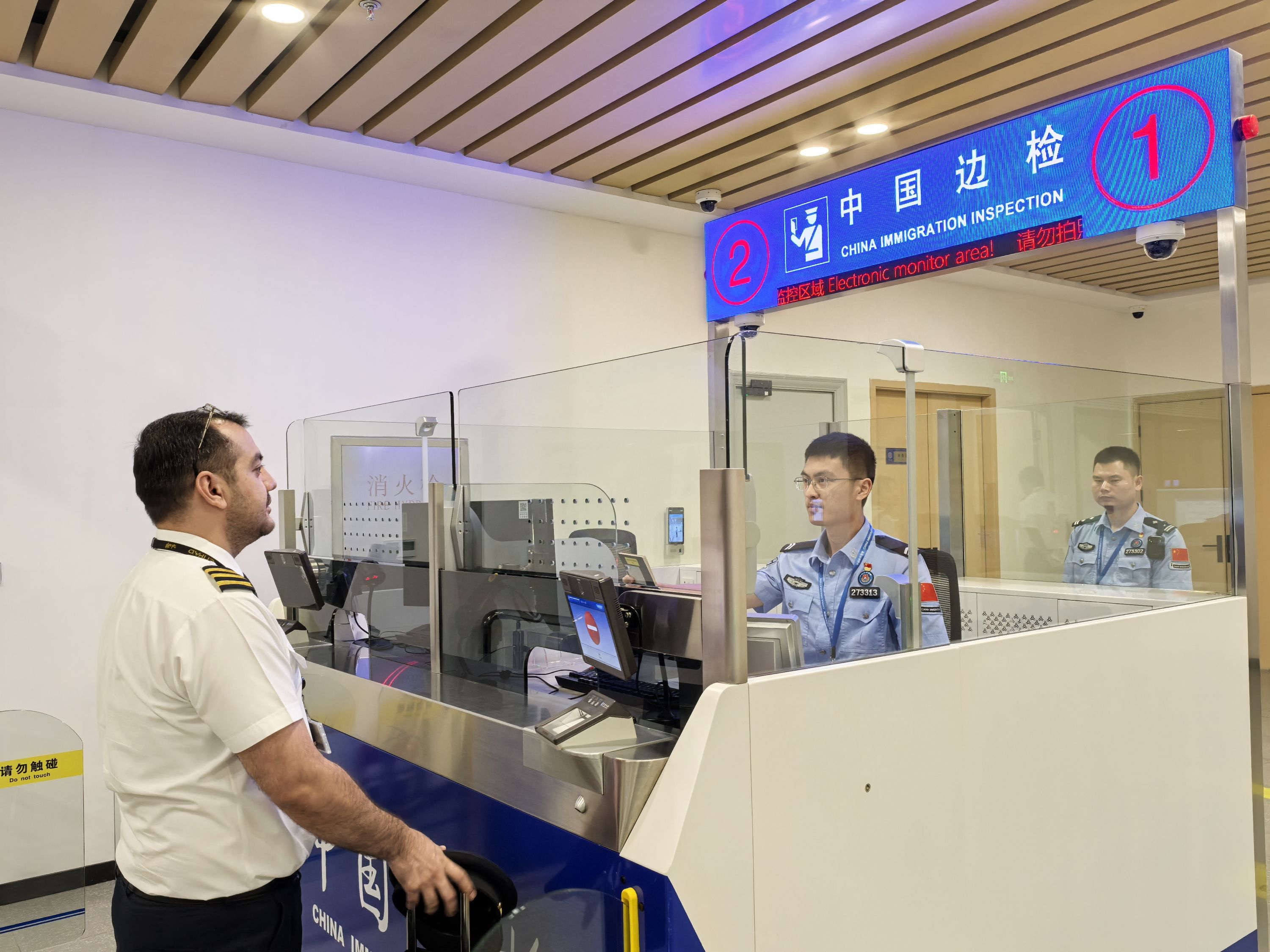 花湖国际机场移民管理警察朱诗渊为外籍机组人员办理入境边防检查手续。