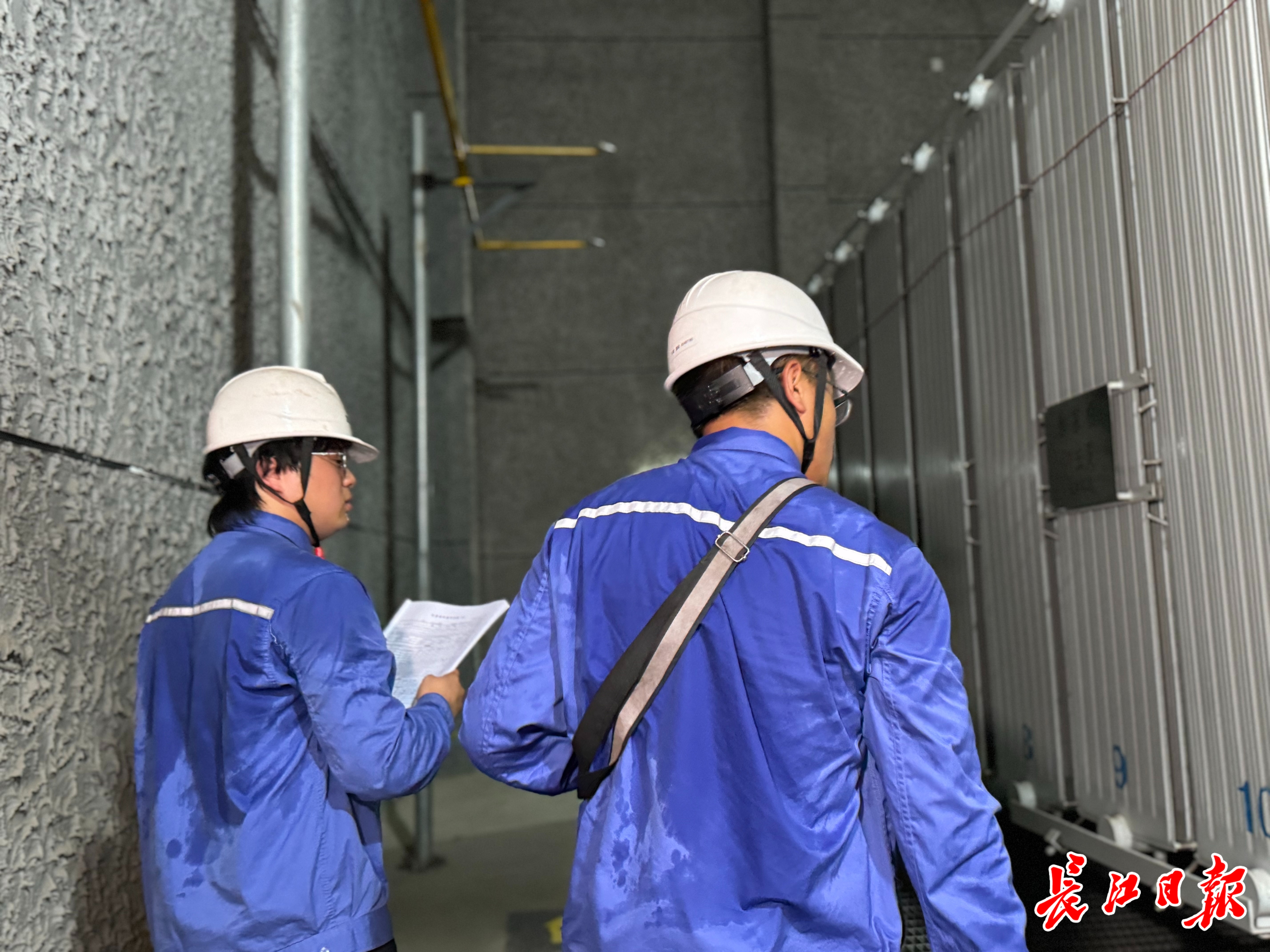 董锐(右)和同事肖欣宇巡视武汉地铁徐家棚主变电所核心区域控制室,工作服全汗湿。