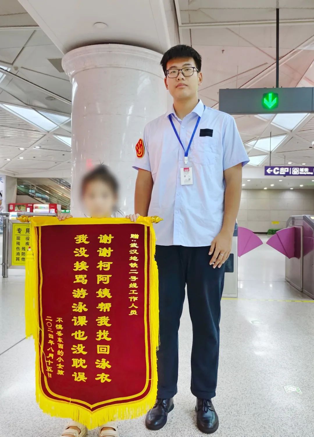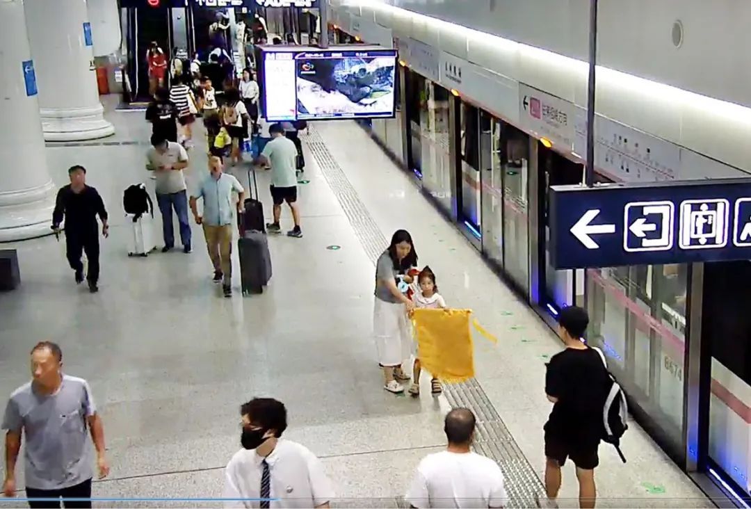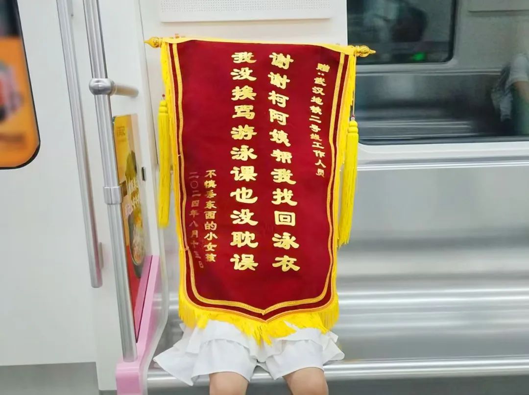 在地铁天河机场站,小铃铛下车后打开锦旗。