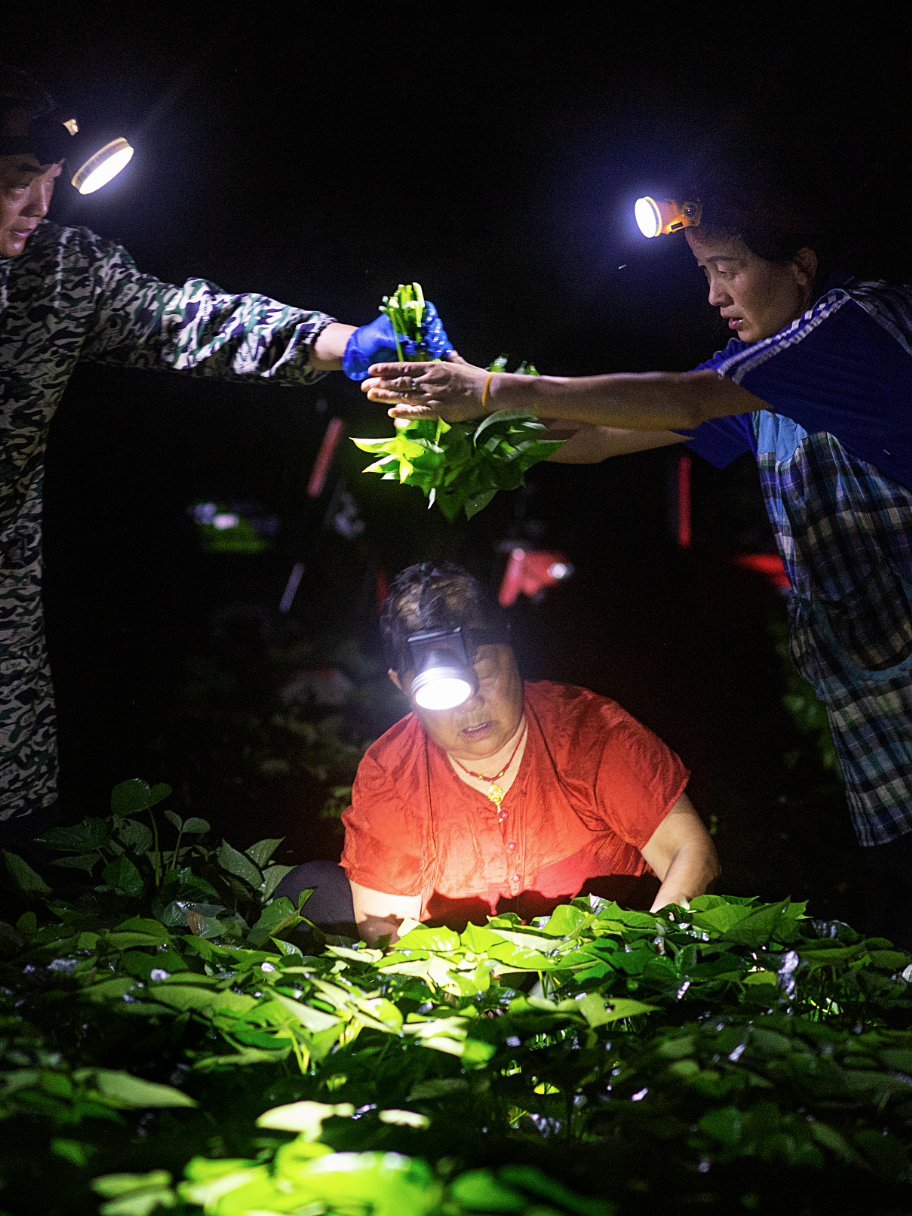 刘孝萍和母亲、丈夫,正戴着头灯,在菜地里忙着收菜。
