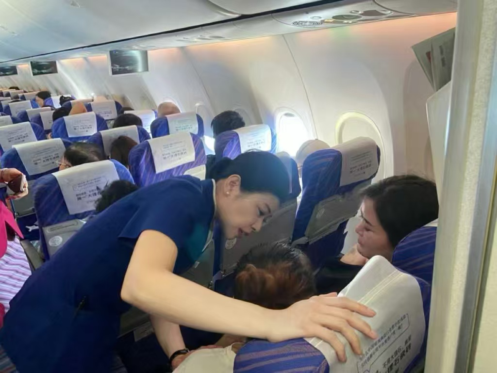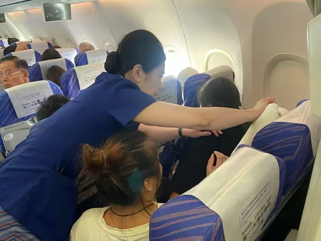 飞机从武汉起飞后不久,一名旅客向乘务员求助,表示自己突发身体不适,非常难受。乘务长冯媛立即上前查看,发现这名旅客呼吸困难,面色苍白,乘务组立即开展机上救助,同时通过客舱广播寻找医生。