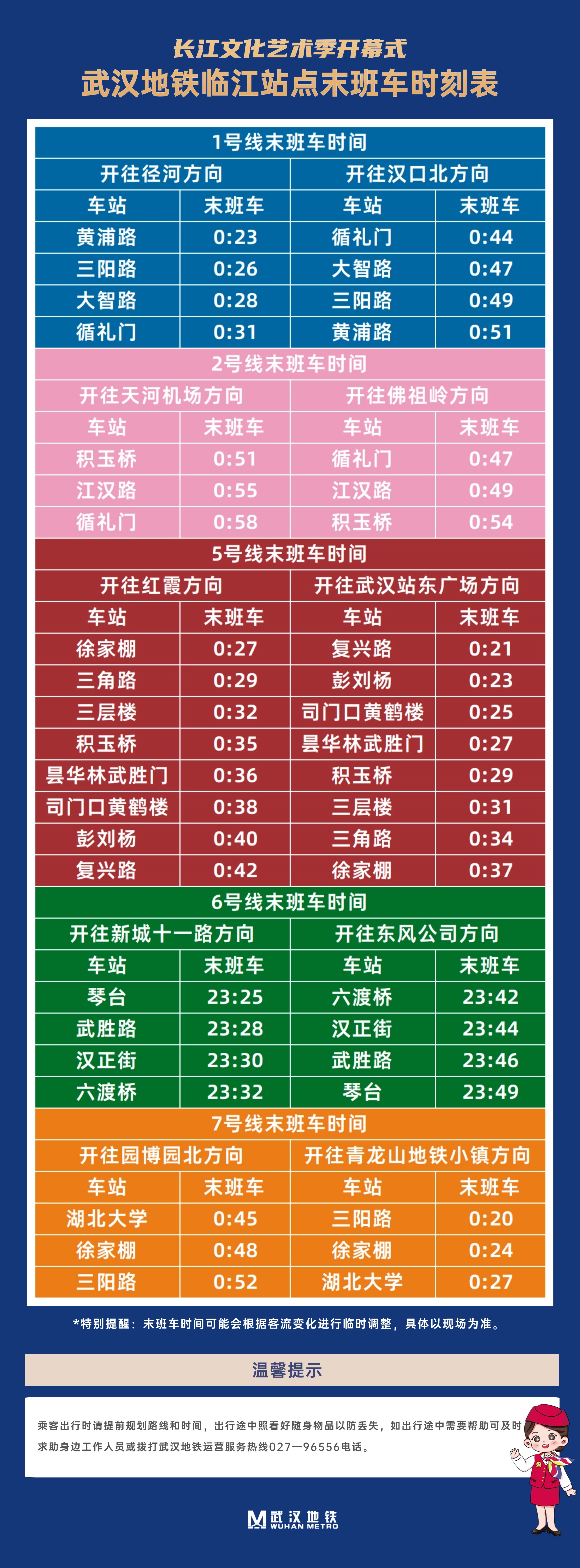9月14日,从武汉地铁运营有限公司获悉,长江文化艺术季于今晚开幕,为保障市民、游客便捷出行,今天,武汉地铁对线网重点线路增投运力,1号线、2号线、5号线、7号线(园博园北站至青龙山地铁小镇站区段)延长运营1小时。