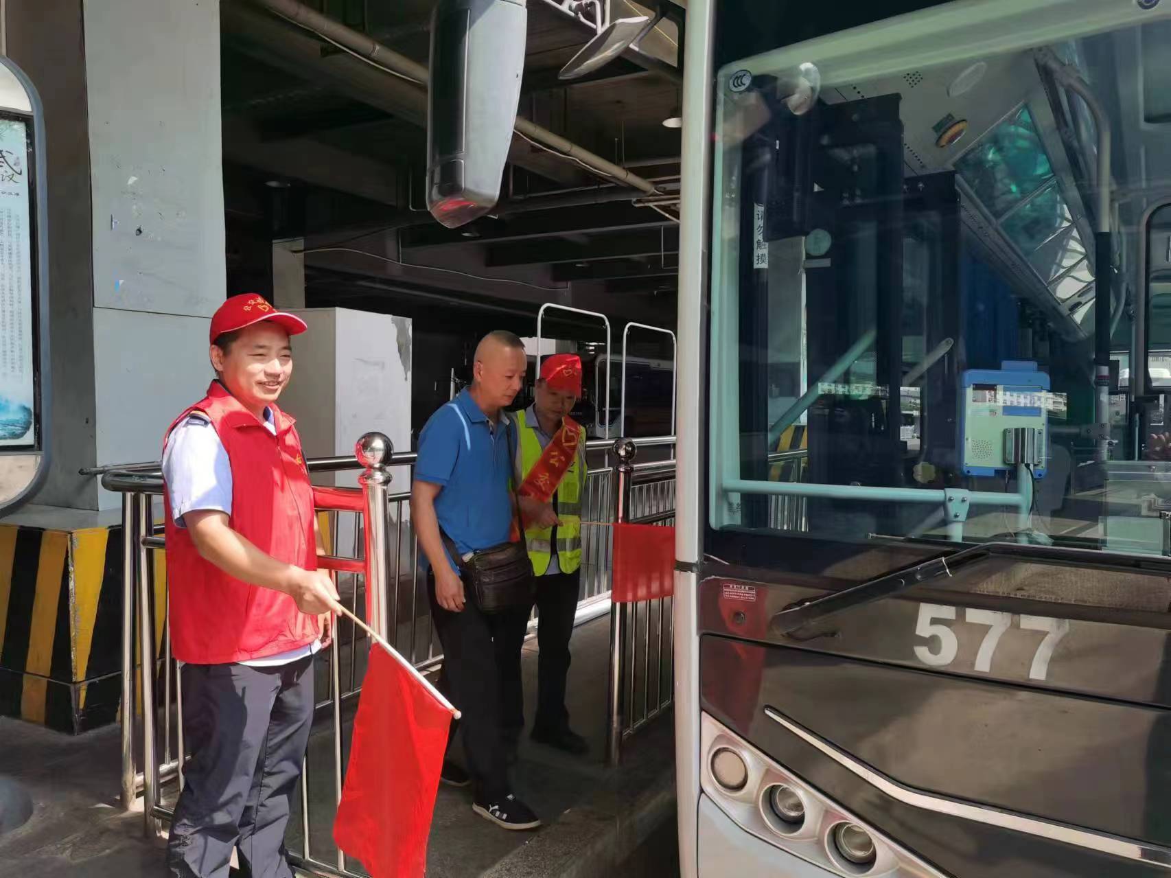 武昌火车站综合体577路公交起点站,公交志愿者引导乘客乘车。