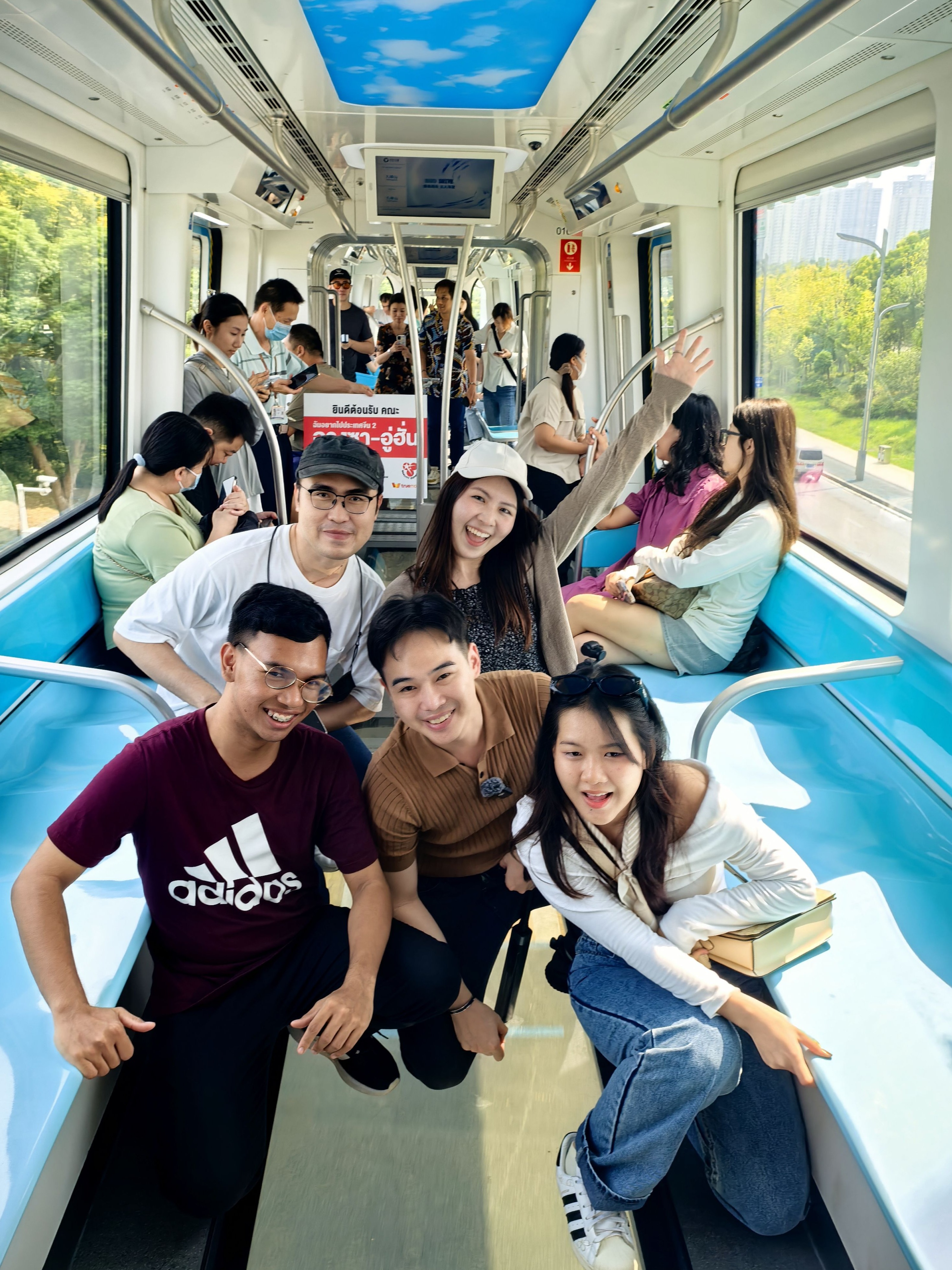泰国旅游博主和同伴们一起乘坐光谷空轨。