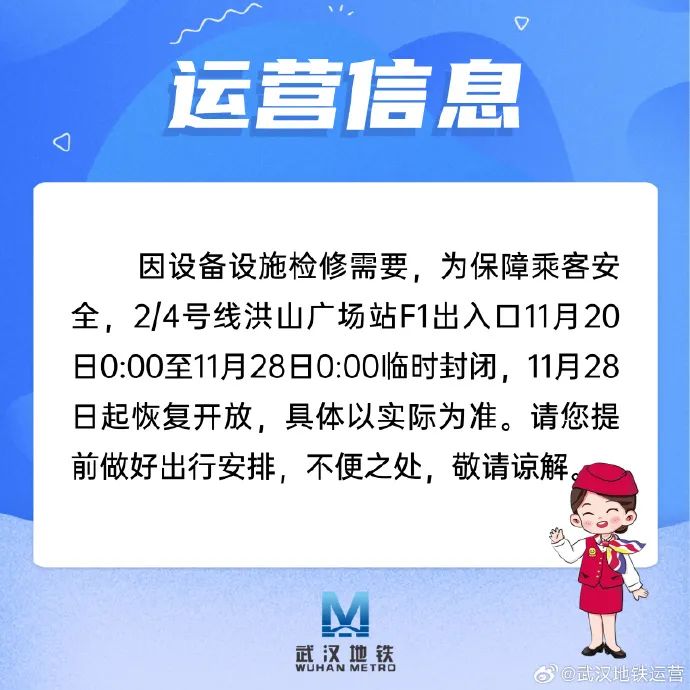 因设备设施检修需要,为保障乘客安全,2/4号线洪山广场站F1出入口11月20日0:00至11月28日0:00临时封闭,11月28日起恢复开放,具体以实际为准。请您提前做好出行安排,不便之处,敬请谅解。