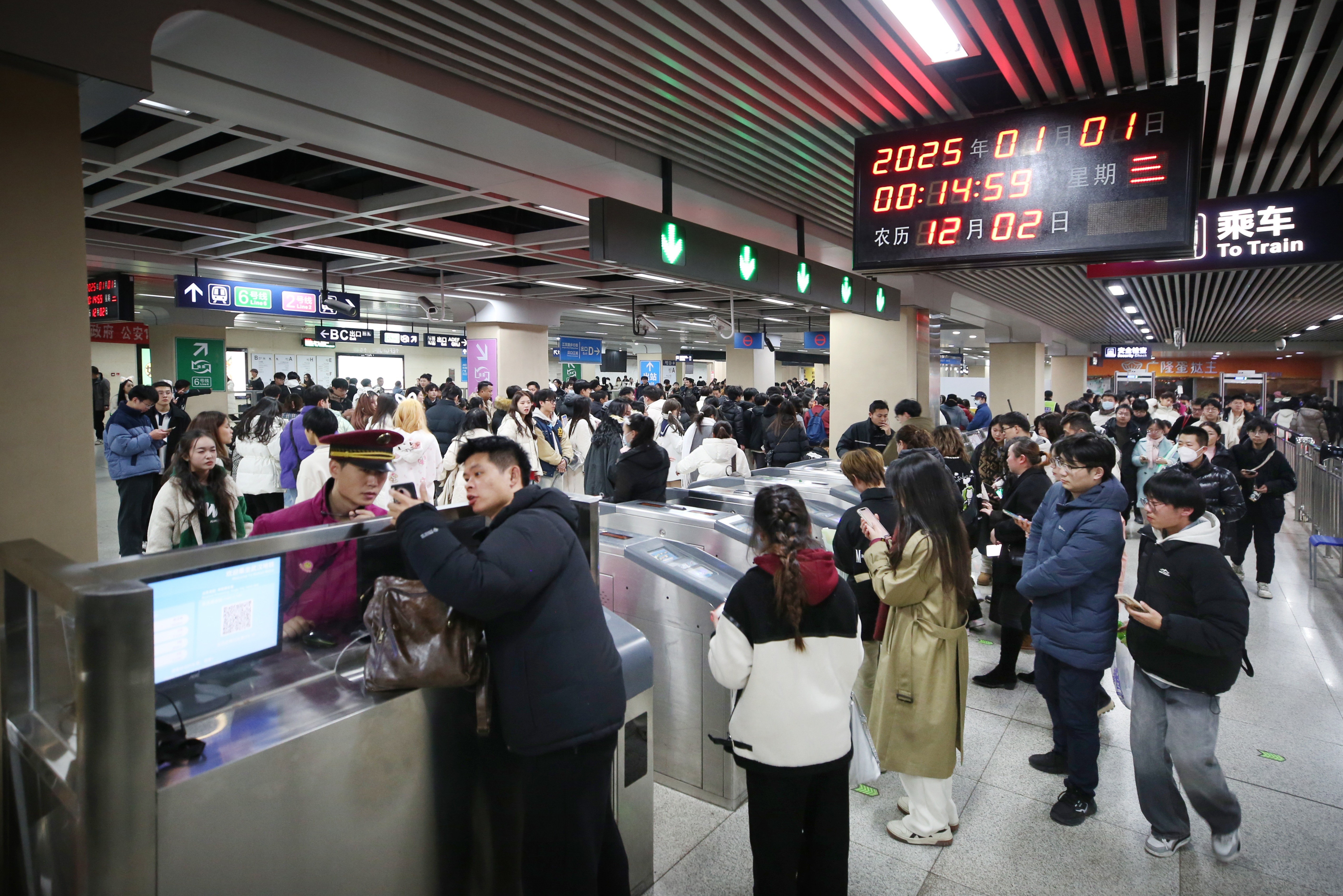 新年第一天凌晨,地铁2号线江汉路站人流如织。