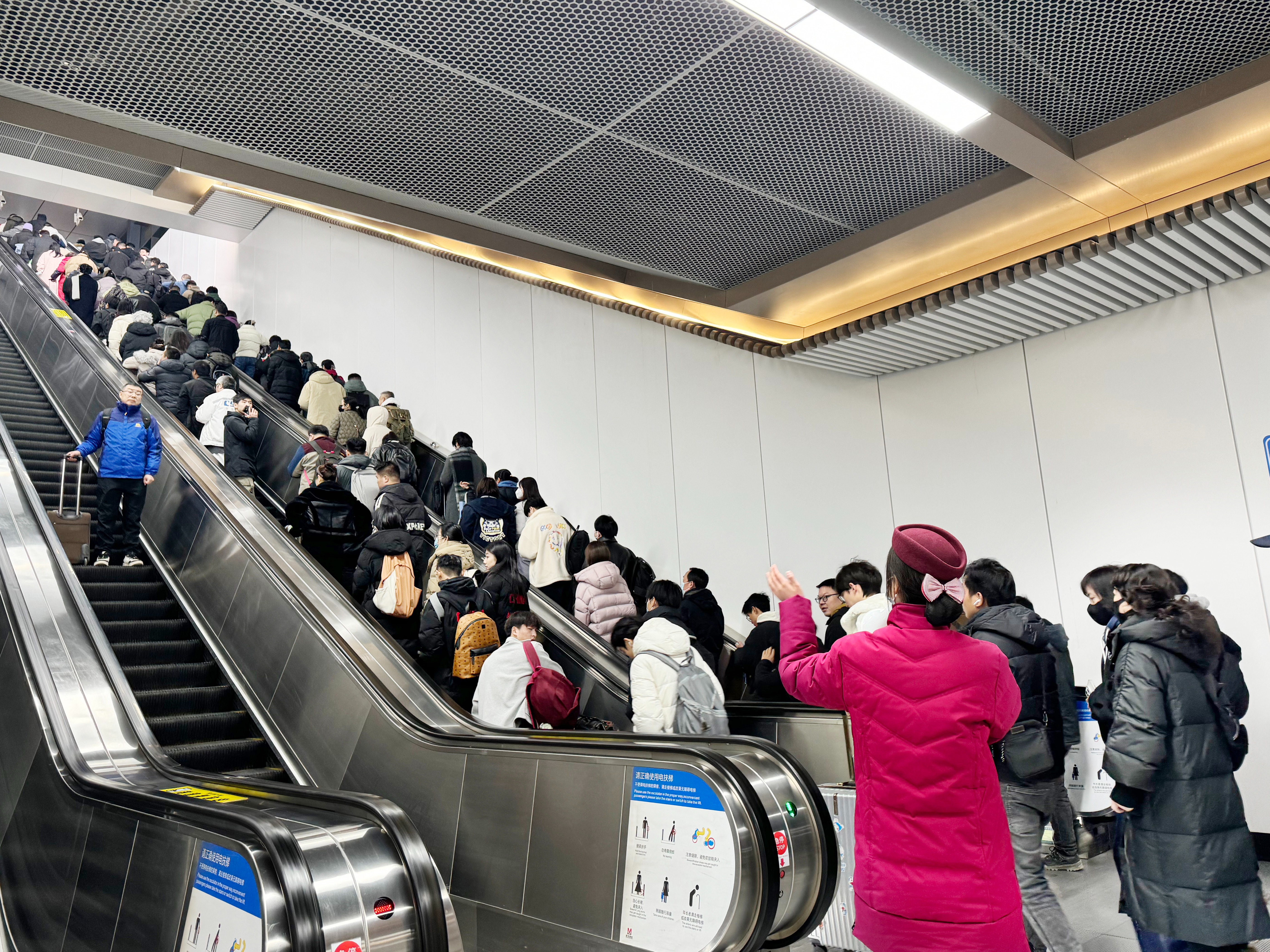 “您好,请从这边进站”“请快速乘梯下楼至站台”“快关门了,快点”……