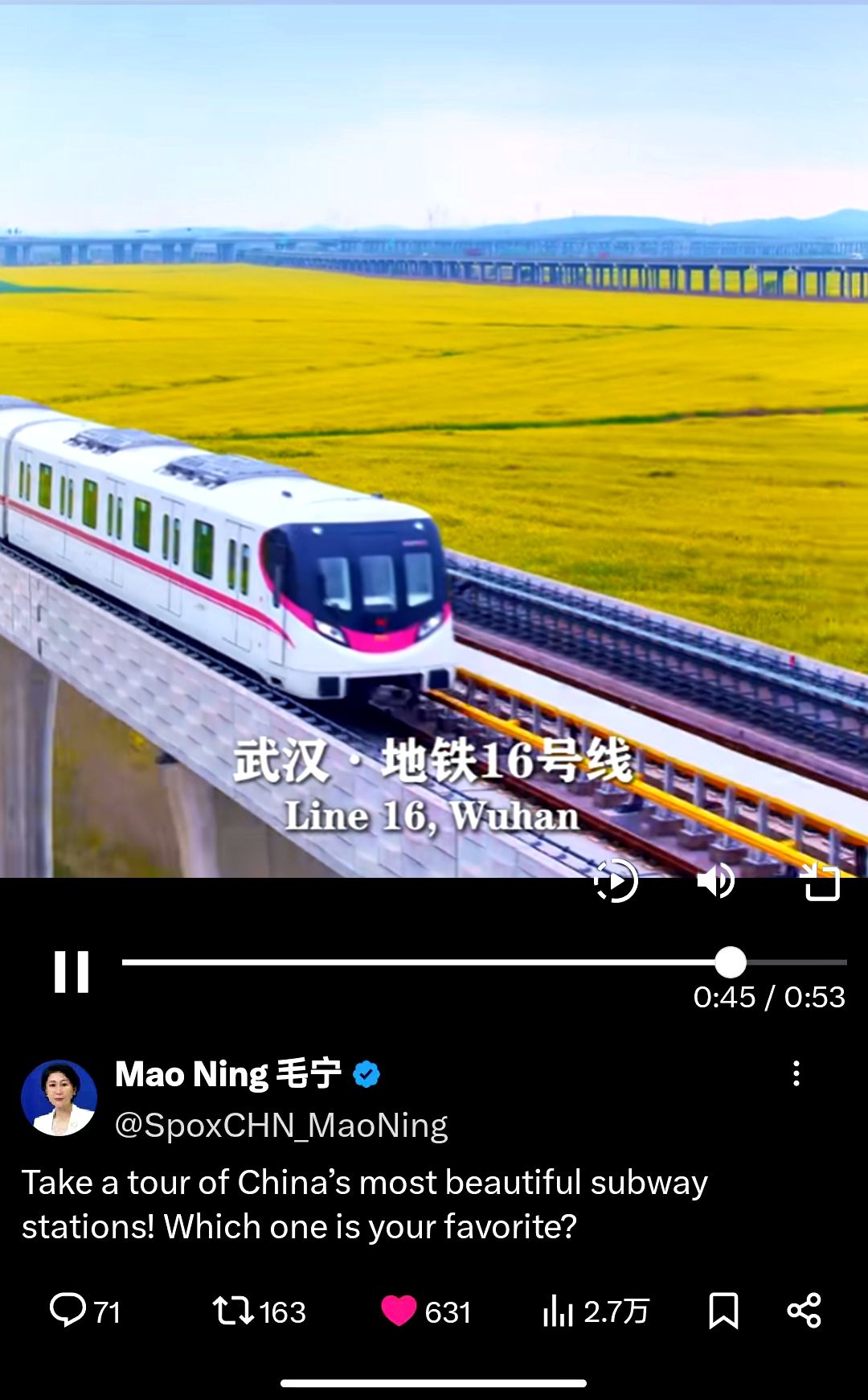 3月14日,外交部发言人毛宁在海外社交平台发布了一段“中国最美地铁站”的视频,视频中展示了全国13座地铁站,武汉轨道交通出现的次数最多,多达4次,包括武汉地铁珞雄路站、武汉商务区站、16号线和光谷空轨。