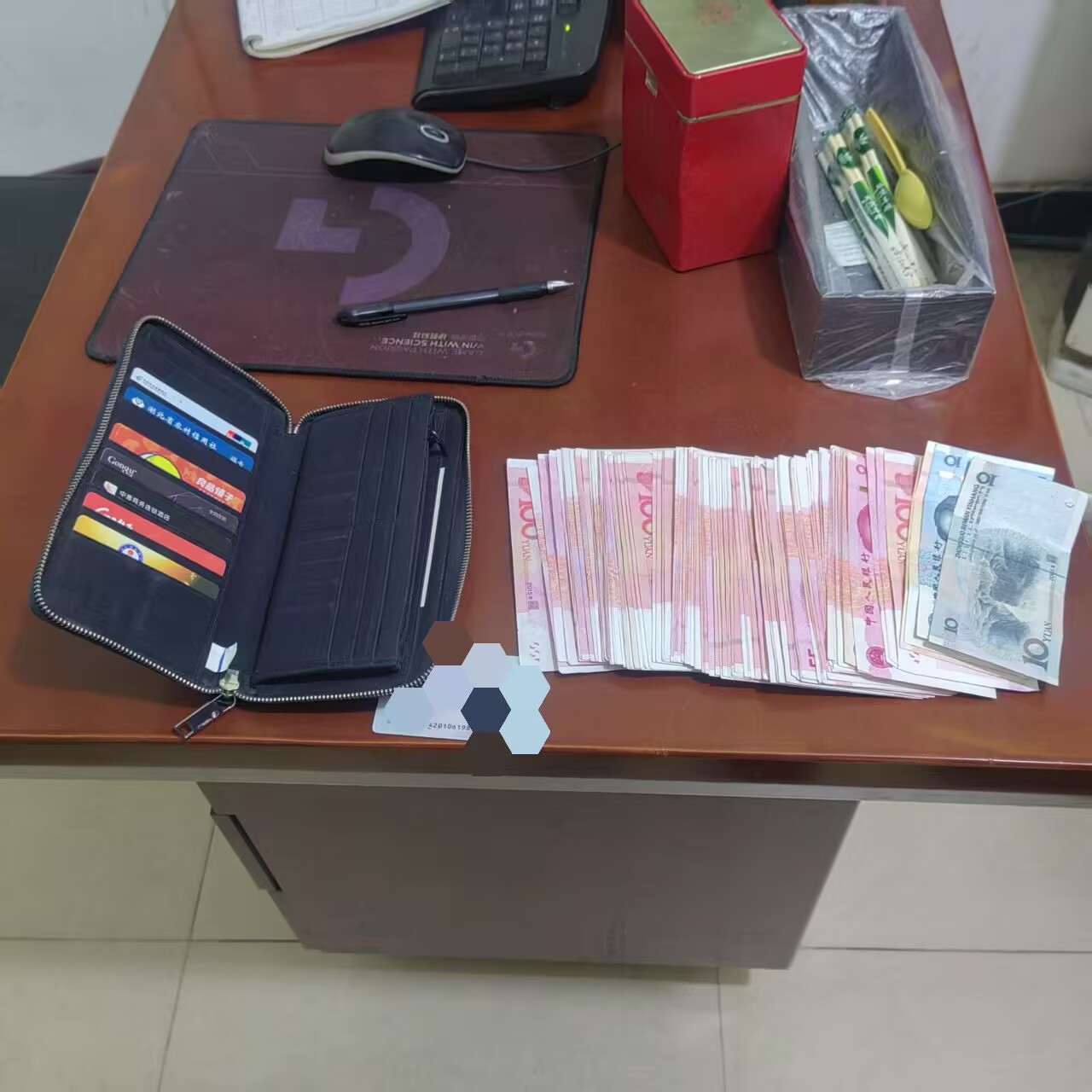 4月12日晚10点左右,结束了一天忙碌工作的雷振华,像往常一样仔细检查车厢。当检查到后排座位时,一个黑色男士奢侈品手包引起了他的注意。打开手包,一沓厚厚的现金和各类银行卡、证件映入眼帘。经过简单清点,现金竟有上万元,加上价值近万元的奢侈品手包,及身份证、驾驶证等重要证件,雷振华心想,丢失如此重要的财物,失主此刻必定心急如焚。