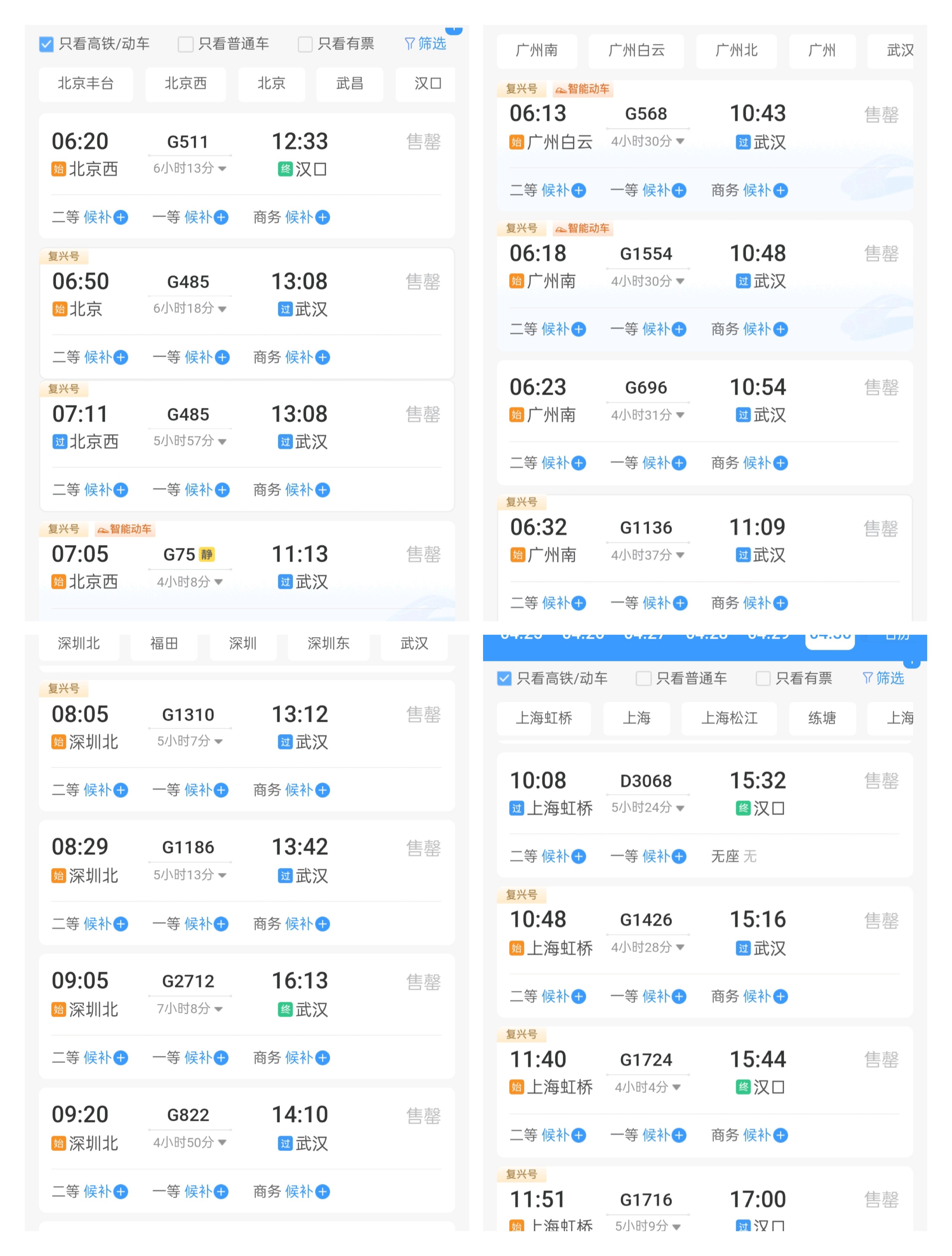 长江日报记者通过“铁路12306”查询发现,4月30日,广州各车站至武汉各车站的近80趟高铁、动车车票已经全部售罄,20多趟普速列车车票,目前也只有少数车次还可以候补购票;深圳至武汉近40趟高铁、动车也全部售罄,6个普速车次目前仅1个车次可以候补购票;北京至武汉40多趟高铁、动车车票全部售罄,17个普速车次仅少数车次可以候补购票;上海至武汉高铁票在开售1分钟后,目前已经有10个车次售罄,手慢无。