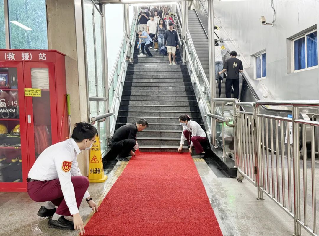 在循礼门站,工作人员6时开班前就对车站所有出入口处铺设好了地垫,在乘客集中通行区域设置提示牌。同时所有1号线站点在重点位置通过有声服务引导乘客有序排队并注意防滑,如遇行动不便、学生乘客等采取“一对一、多对一”全过程帮扶。