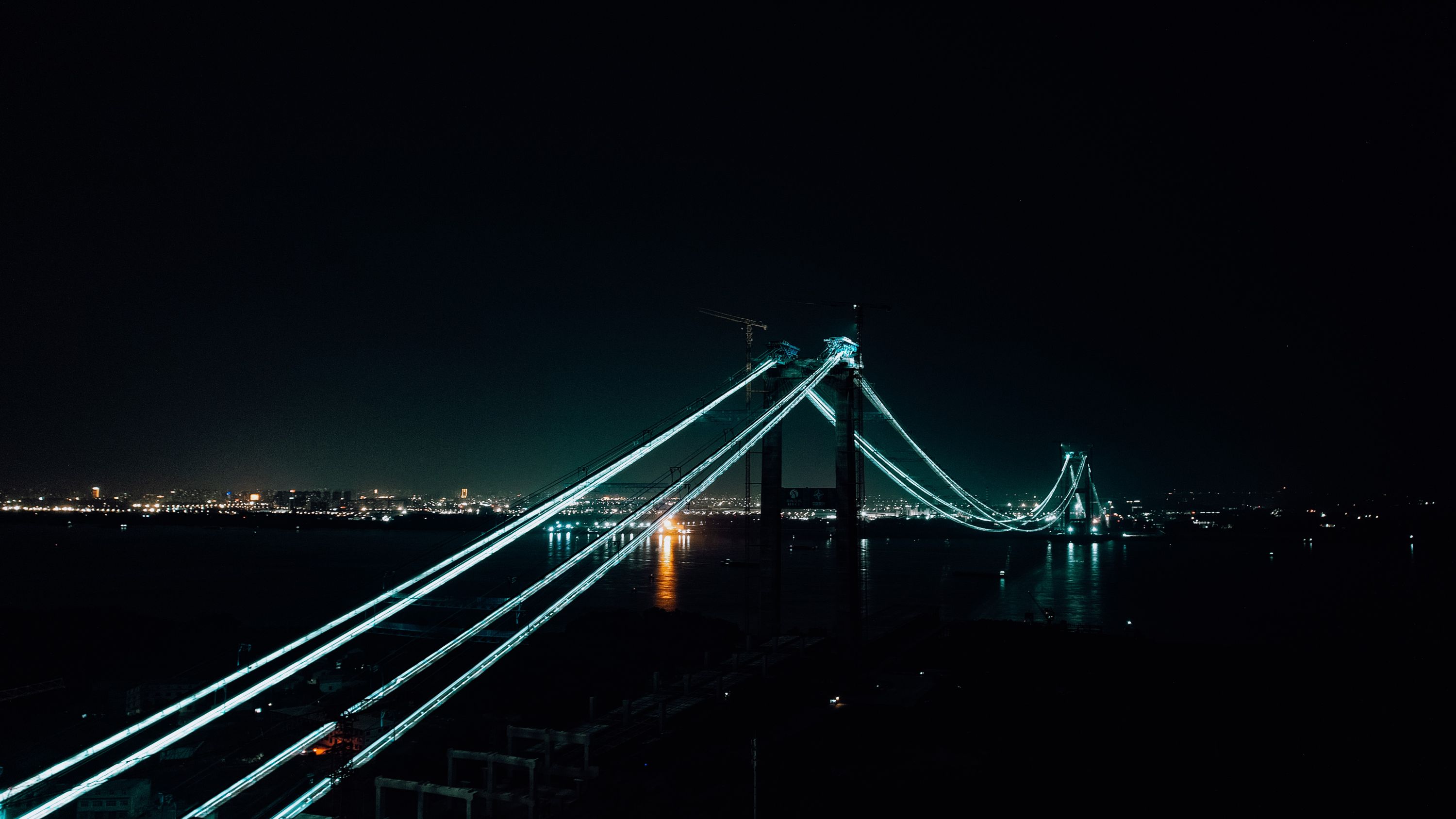 站在江边远眺,四根巨大的主缆在蓝天白云的映衬下熠熠生辉,宛如四条钢铁巨龙,从南锚碇昂首出发,跨越浩荡江面,经北岸主塔和南岸主塔,最终抵达北锚碇,场面蔚为壮观。