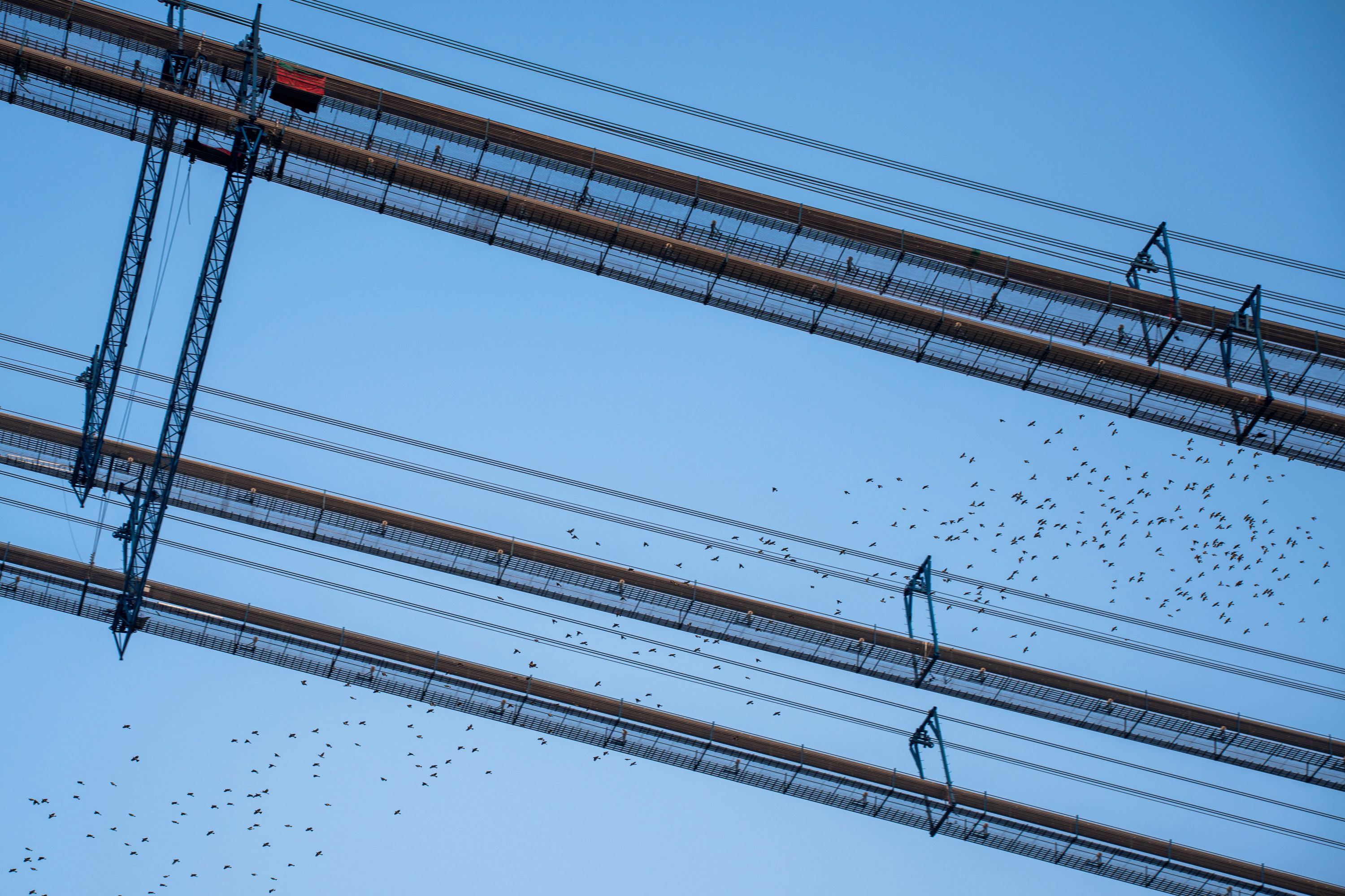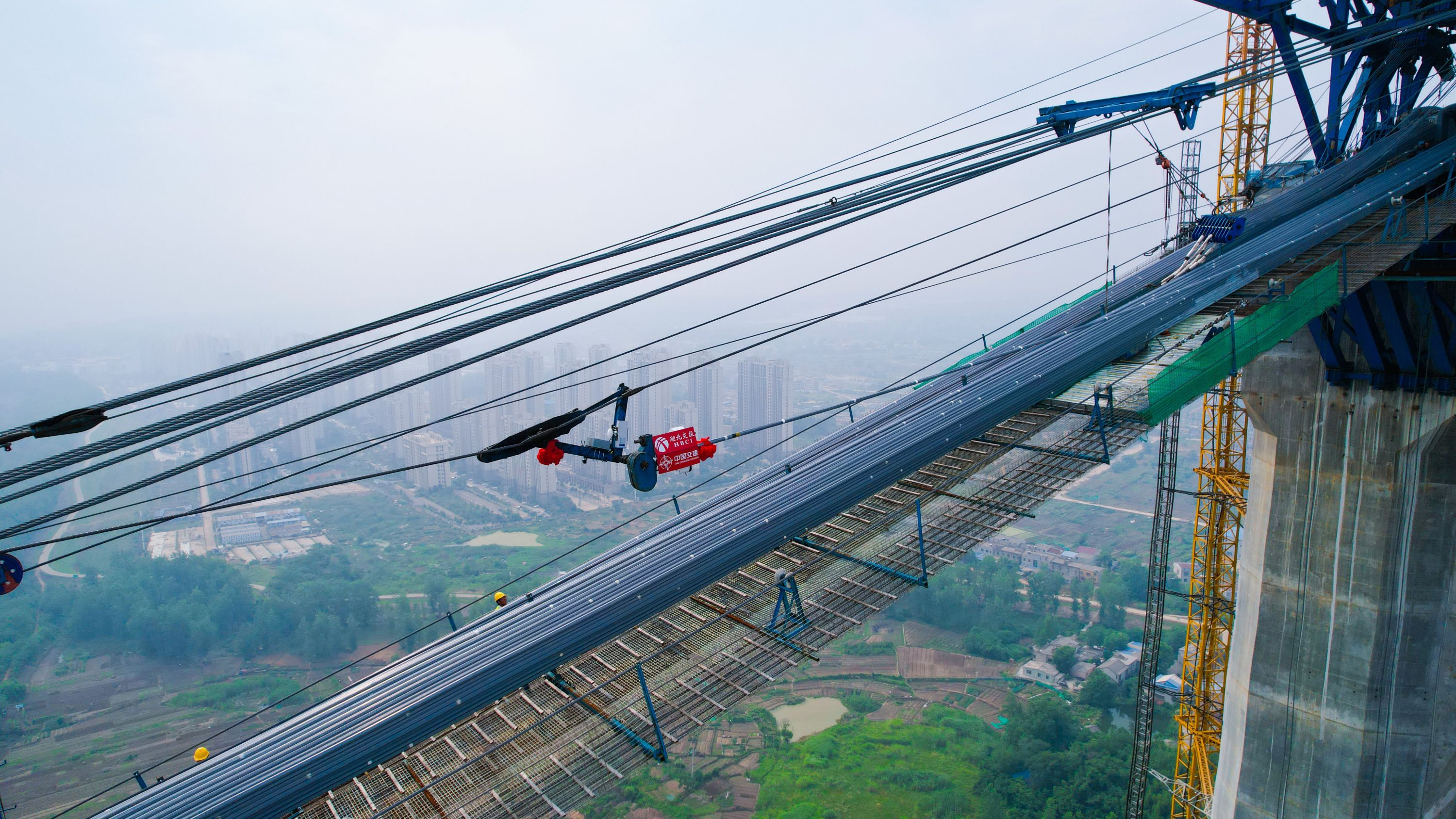 上午9点58分,现场指挥一声令下,主缆架设工程进入最终阶段。卷扬机缓缓启动,牵引着最后一根索股向北岸进发。在猫道上,施工人员紧张而有序地进行着各项操作,确保索股顺利通过各个滑轮和导向装置。通过对实时监测数据的精准分析,施工人员对索股的位置和张力进行微调,最终确保其精准到达预定位置。