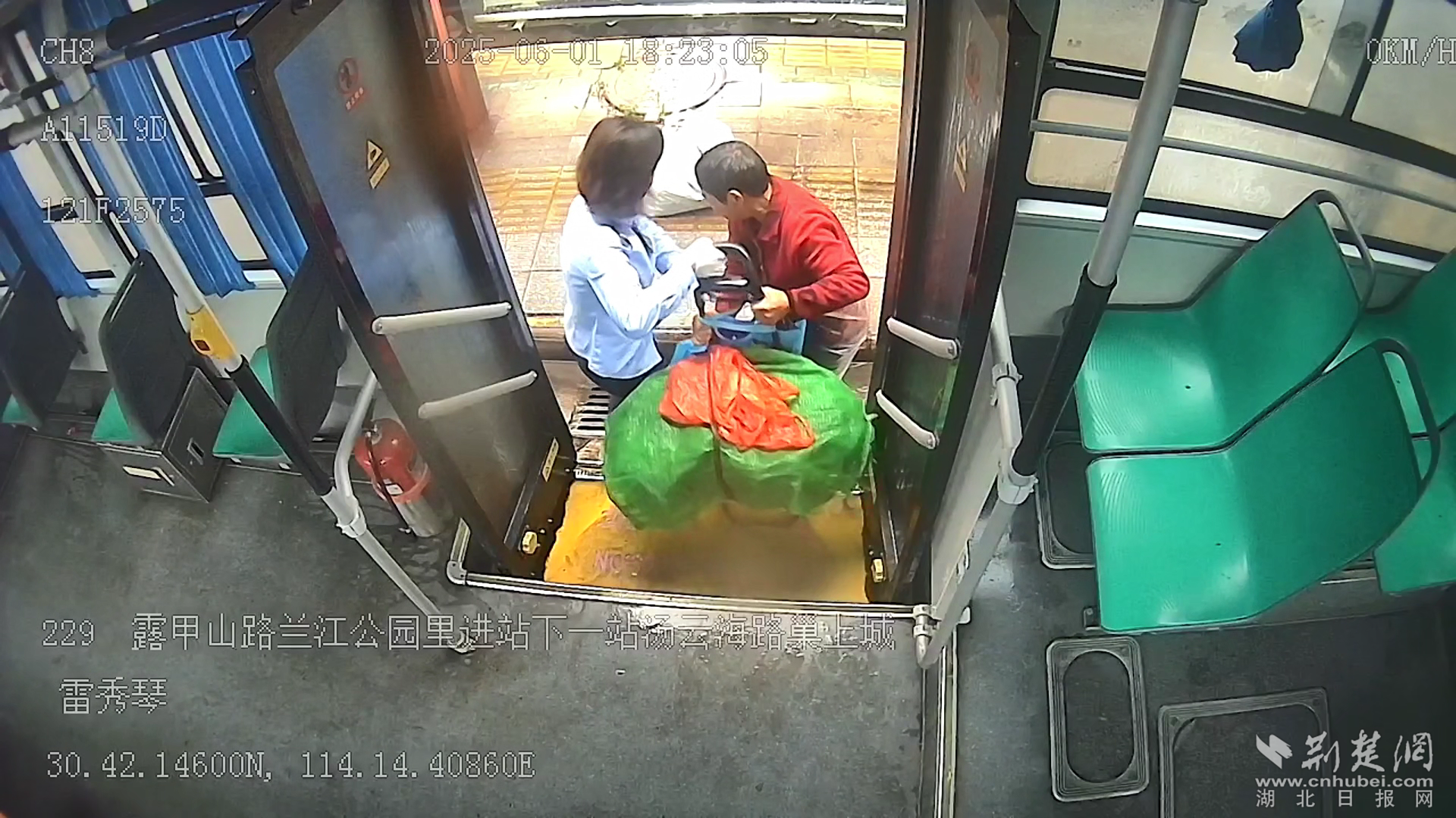 当日18点10分,武汉公交229路司机雷秀琴像往常一样驾车运营。车辆行驶至巨龙大道歌林花园站时,一位用小拖车拖着一车货物和蔬菜的老奶奶在风雨中示意乘车。老人身影单薄,几十斤的重物让她的行动带来不便。雷秀琴见状,立马下车,化身“搬运工”,先帮老人将一大袋菜提到车上,再返身接过拖车把手,连车带货一起拖进车厢,为老人安排好座位,贴心提醒老人:“雨天地滑,请坐稳扶好、注意安全。”