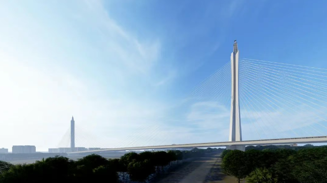 项目主线高架跨越地铁五号线工人村车辆段及武石化铁路专用线,设计采用双转体斜拉桥,全长703米,桥宽33.5—34米,塔高115.8米。