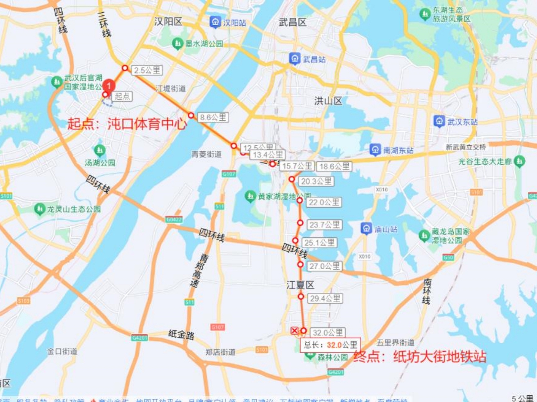 纸坊大街地铁站至武汉体育中心专线,去行由纸坊大街地铁站G出口始发,途经文化大道、三环线至武汉体育中心。回行则由武汉体育中心经三环、文化大道至纸坊大街地铁站A出口。线路单程32公里,沿途停靠纸坊大街G出入口(中建龙城)、联投广场、清江泓景、大花岭、联投龙湾公园、澎湖湾、文化大道新路村、文化大道马嘴村、文化大道融创智谷、武汉体育中心,共10个站点。