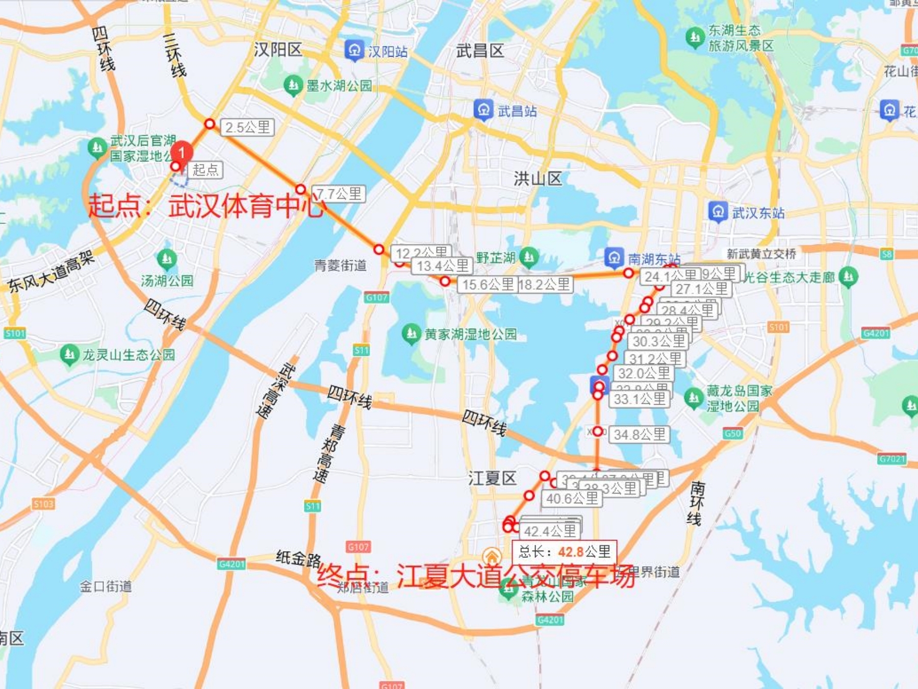 江夏大道中央大街公交停车场专线,去行由江夏大道中央大街公交停车场始发,经江夏大道庙山、大学园路、三环线抵达武汉体育中心。回行由武汉体育中心、三环线、大学园路、江夏大道庙山至中央大街公交停车场。线路单程42公里,沿途停靠江夏大道中央大街公交停车场、江夏大道沙羡街、江夏大道大花山、江夏大道向阳村、江夏大道肖家塝、江夏大道海上五月花、江夏大道医药园、大学园路南泥湾、大学园路化徐村、武汉体育中心,共10个站点。