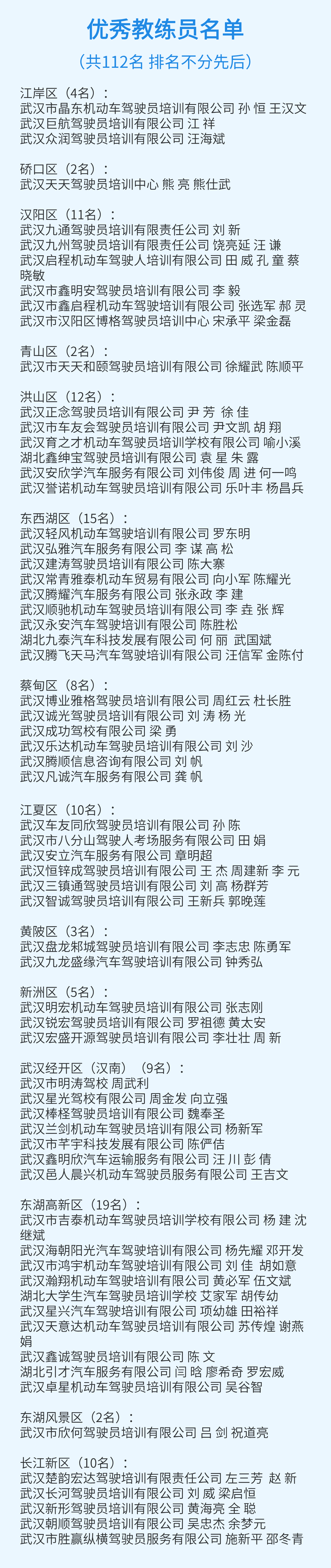 据了解,这112名优秀教练员均来自全市依法备案的驾培机构,为在职教练员。他们从事驾驶培训教学工作均满3年,且近三年内无重大交通违法、教学事故或有责投诉等负面记录。