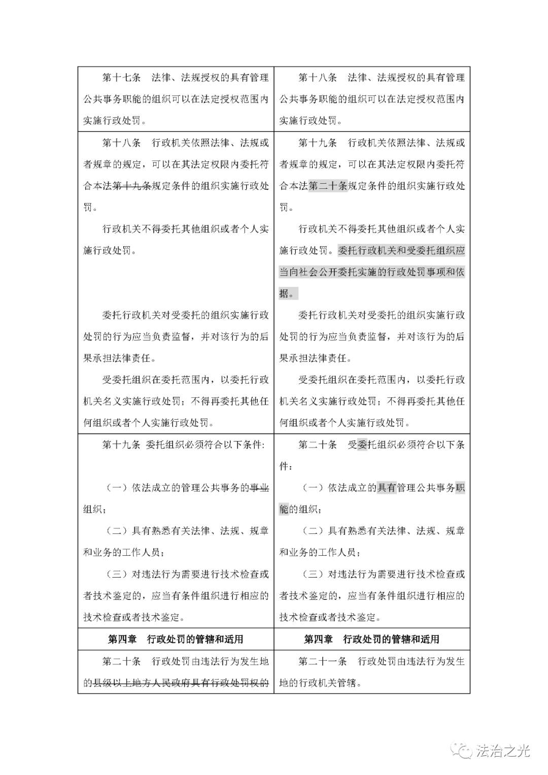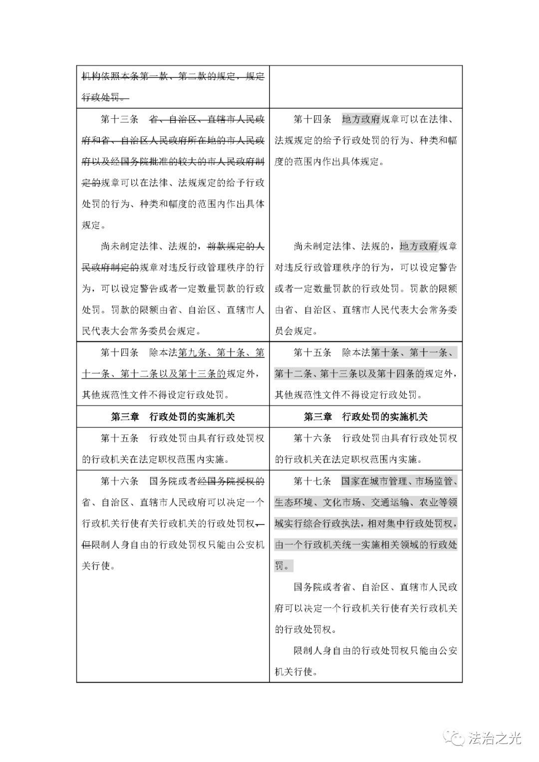 根据党和国家机构改革和行政执法体制改革要求,明确综合行政执法的法律地位,增加规定:国家在城市管理、市场监管、生态环境、文化市场、交通运输、农业等领域实行综合行政执法,相对集中行政处罚权,由一个行政机关统一实施相关领域的行政处罚。同时,根据基层整合审批服务执法力量改革要求,推进行政执法权限和力量向基层延伸和下沉,增加规定:省、自治区、直辖市根据当地实际情况,可以决定符合条件的乡镇人民政府、街道办事处对其管辖区域内的违法行为行使有关县级人民政府部门的部分行政处罚权。(修订草案第十七条第一款、第二十二条第二款)